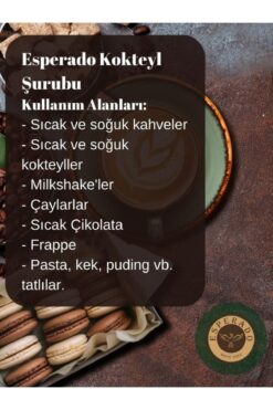 kahve, çay gibi sıcak içeceklerde aromalandırma amacıyla 1/8 oranında kullanılabilir. Eğer yalnızca şurubun özgün lezzetini deneyimlemek isterseniz de sıcak veya soğuk su ile 1/8 oranında karıştırılarak mükemmel içecekler hazırlayabilirsiniz. Kullanım Alanları : – Kahvelerde – Milkshake lerde – Çaylar da – Sıcak çikolata da – Frappe de – Soğuk kahvelerde – Sıcak ve soğuk kokteylerde – Tatlılarda Esperado Kahve Kokteyl Şurubu İçindekiler: Su.Kıvam verici (Selüloz sakızı,Polidekstroz),Tatlandırıcılar (Stevia ekstratı,Sodyum sakkarin, Asesulfam k), Renklendirici (Karamel 150d), Doğal aroma vericisi (Karamel),Koruyucu (Sodyum benzoat,Potasyum sorbat) – Ürün çeşidine göre Aroma çeşidi değişmektedir. – Doğal renklendirici kullanılmıştır. – Şeker içermez – Işletme kayıt no: Tr-35-K-045349 – Gramaj 250 ml (x 3) : 750 ml