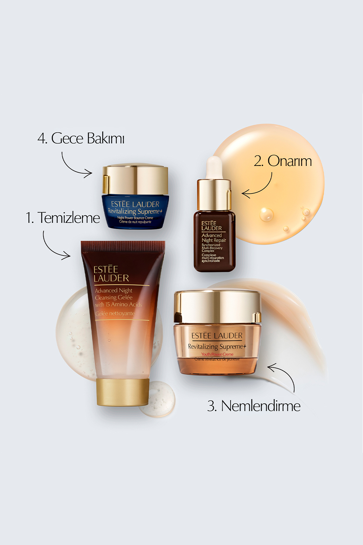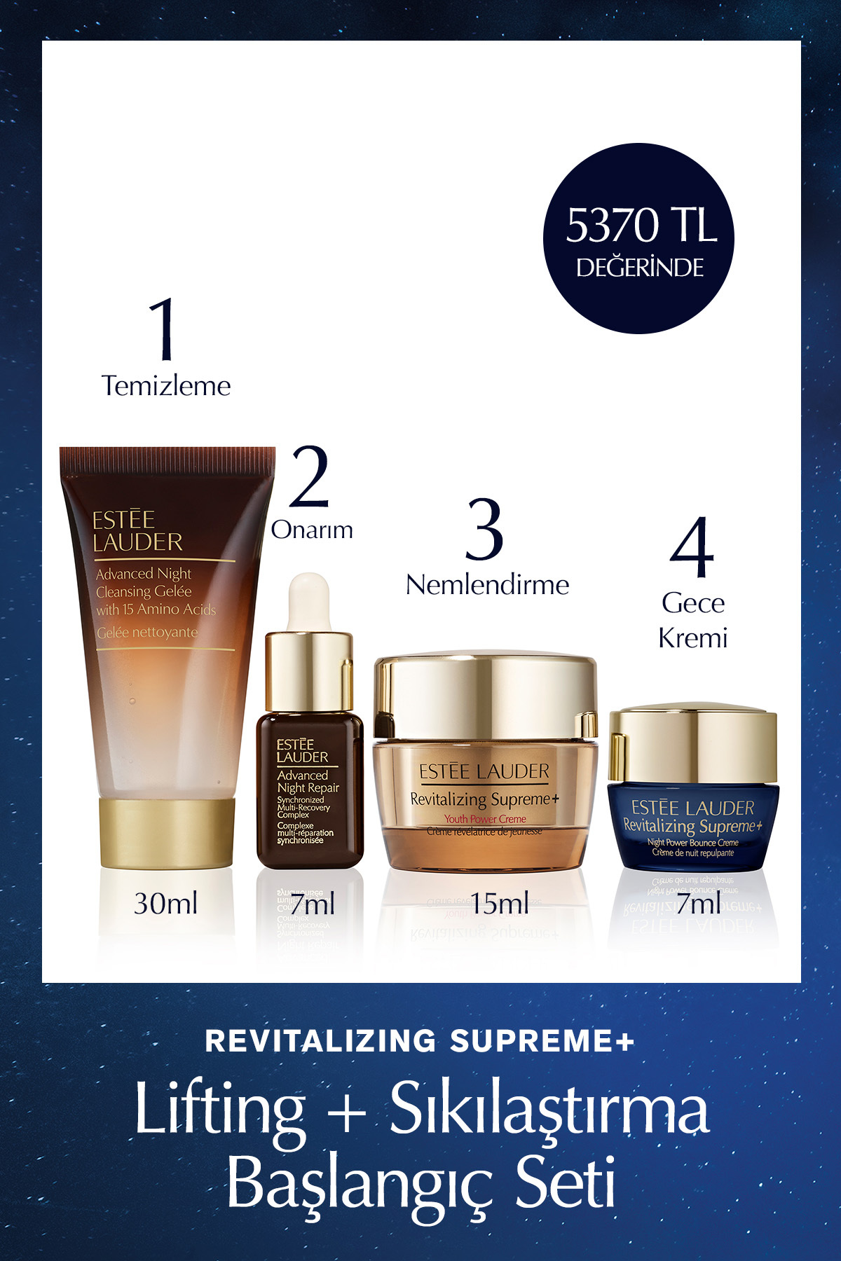 Estee Lauder Revitalizing Supreme+ Lifting+Sıkılaştırma Seti-Serum 7ml+ Temizleme 30ml+ Gece Kremi 7ml+ Krem 15ml