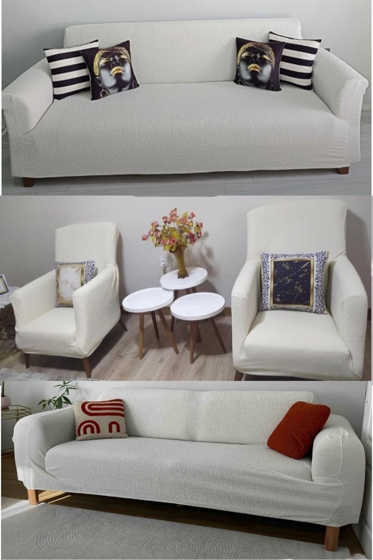etleshome Jakarlı 3 3 1 1 Krem Rengi Lastikli Koltuk Örtüsü Kanepe Çekyat Örtüsü Koltuk Kılıfı Takımı