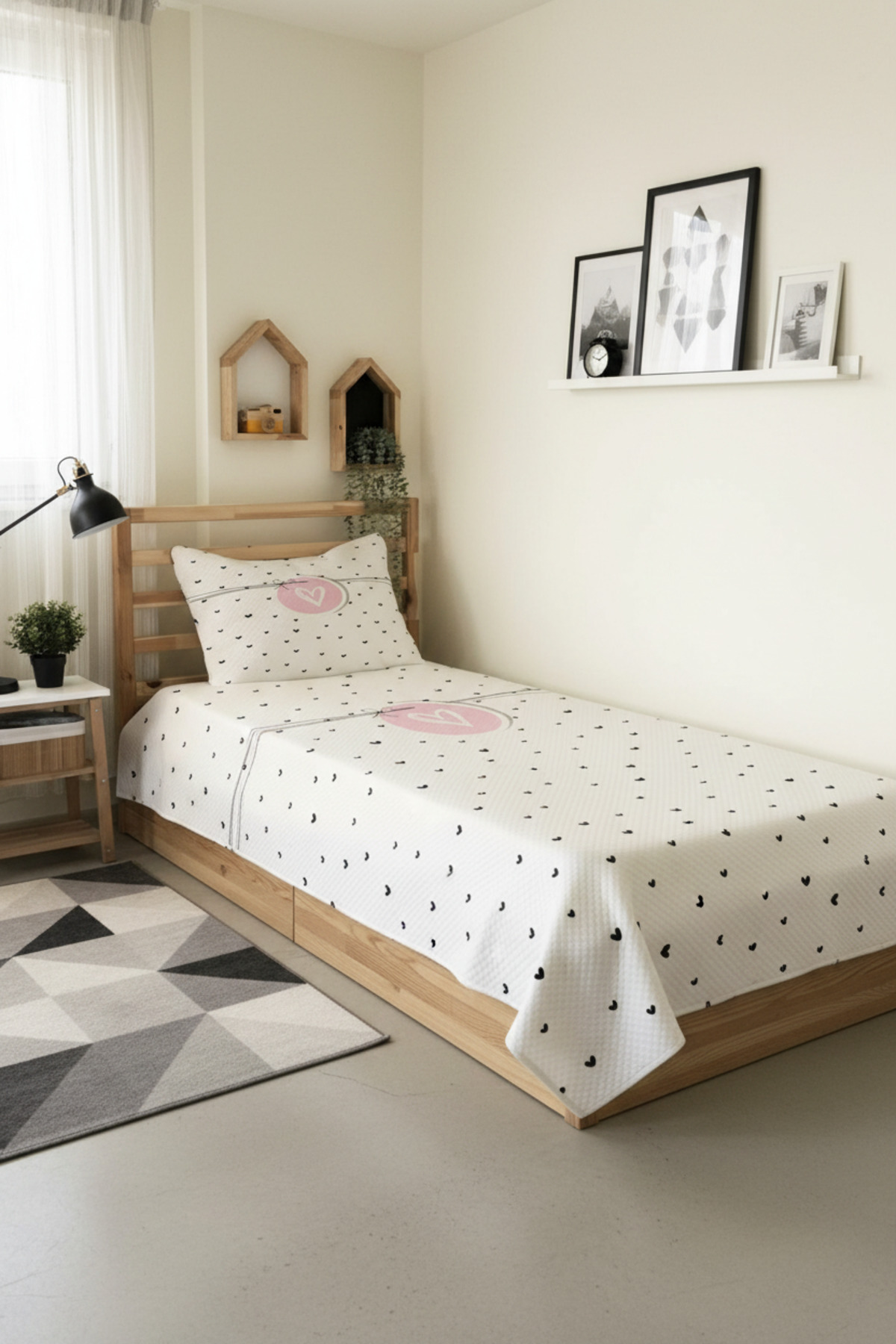 Evmila Kalp Desenli Bebek Ve Çocuk Baskılı Tek Kişilik Pike Takımı 160×230 Beyaz