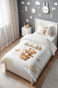 EVPANYA Bulutlar Üzerindeki Sevimli Ayıcık Desenli Tek Kişilik Bebek Çocuk Nevresim Seti