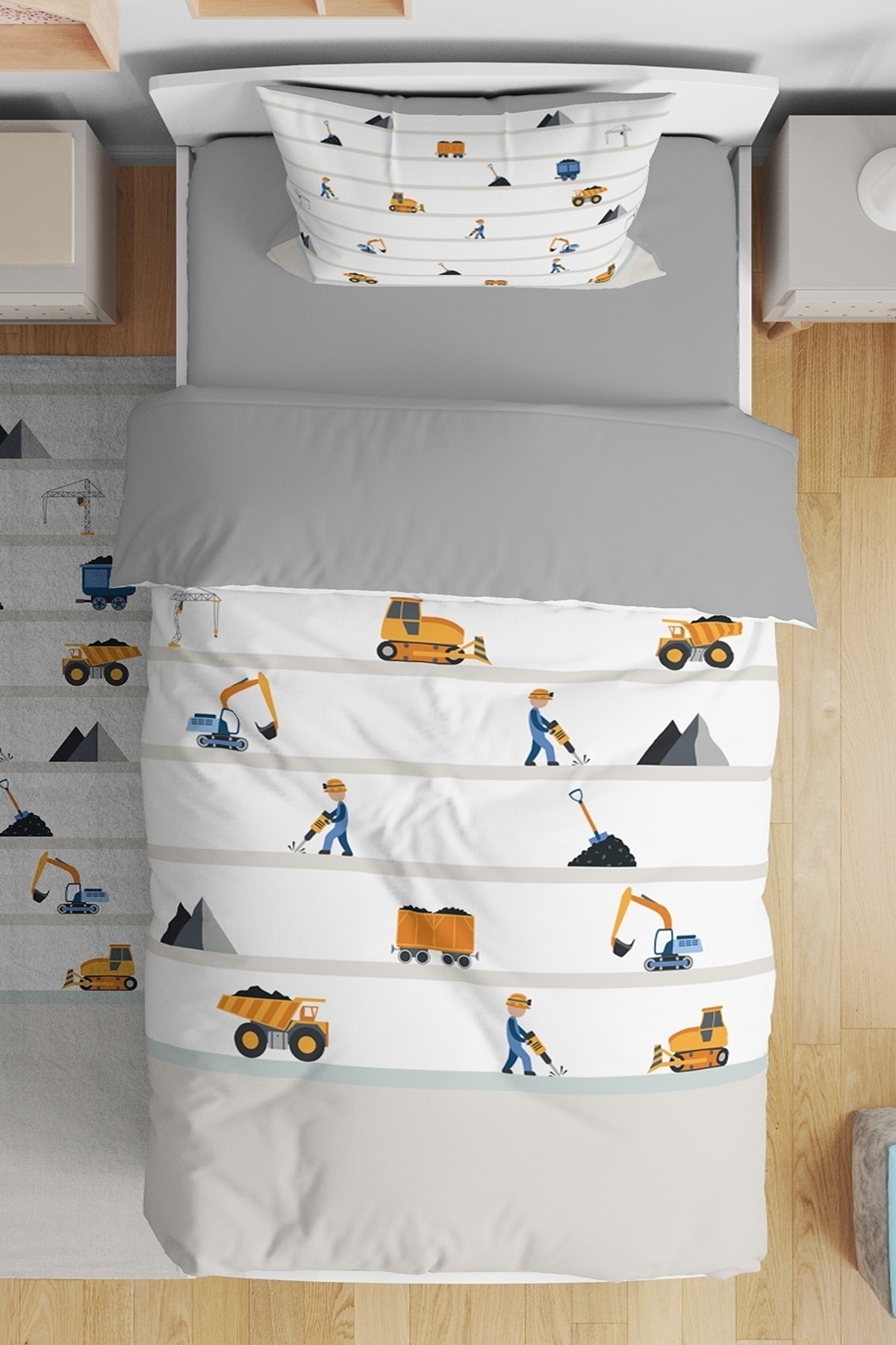 EVPANYA İnşaat Araçları Desenli Tek Kişilik Bebek Çocuk Nevresim Seti