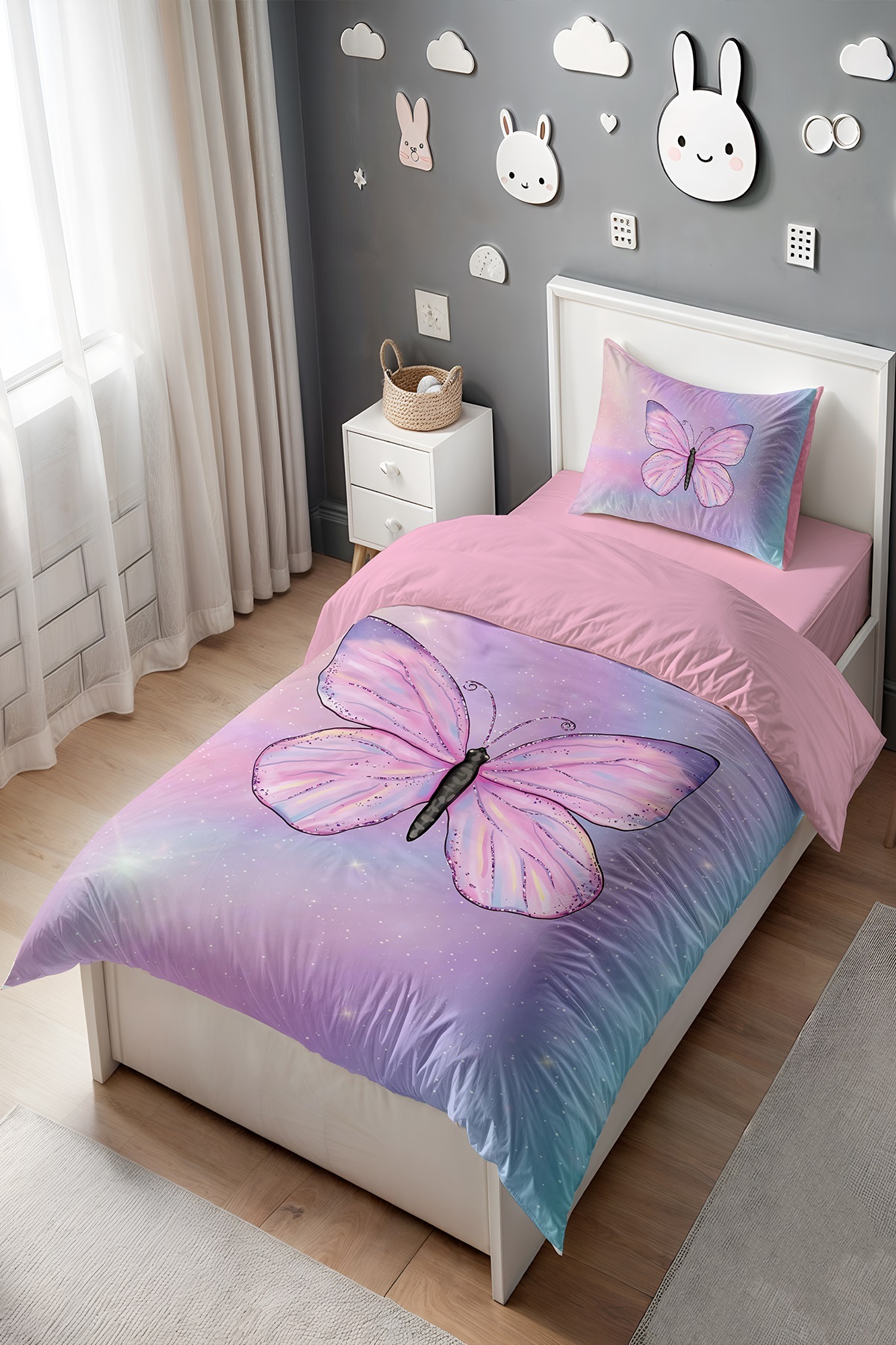 EVPANYA Işıltılı Kelebek Desenli Tek Kişilik Bebek Çocuk Nevresim Seti