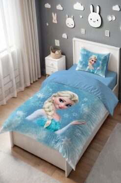EVPANYA Kartaneli Mavi Elsa Desenli Tek Kişilik Bebek Çocuk Nevresim Seti