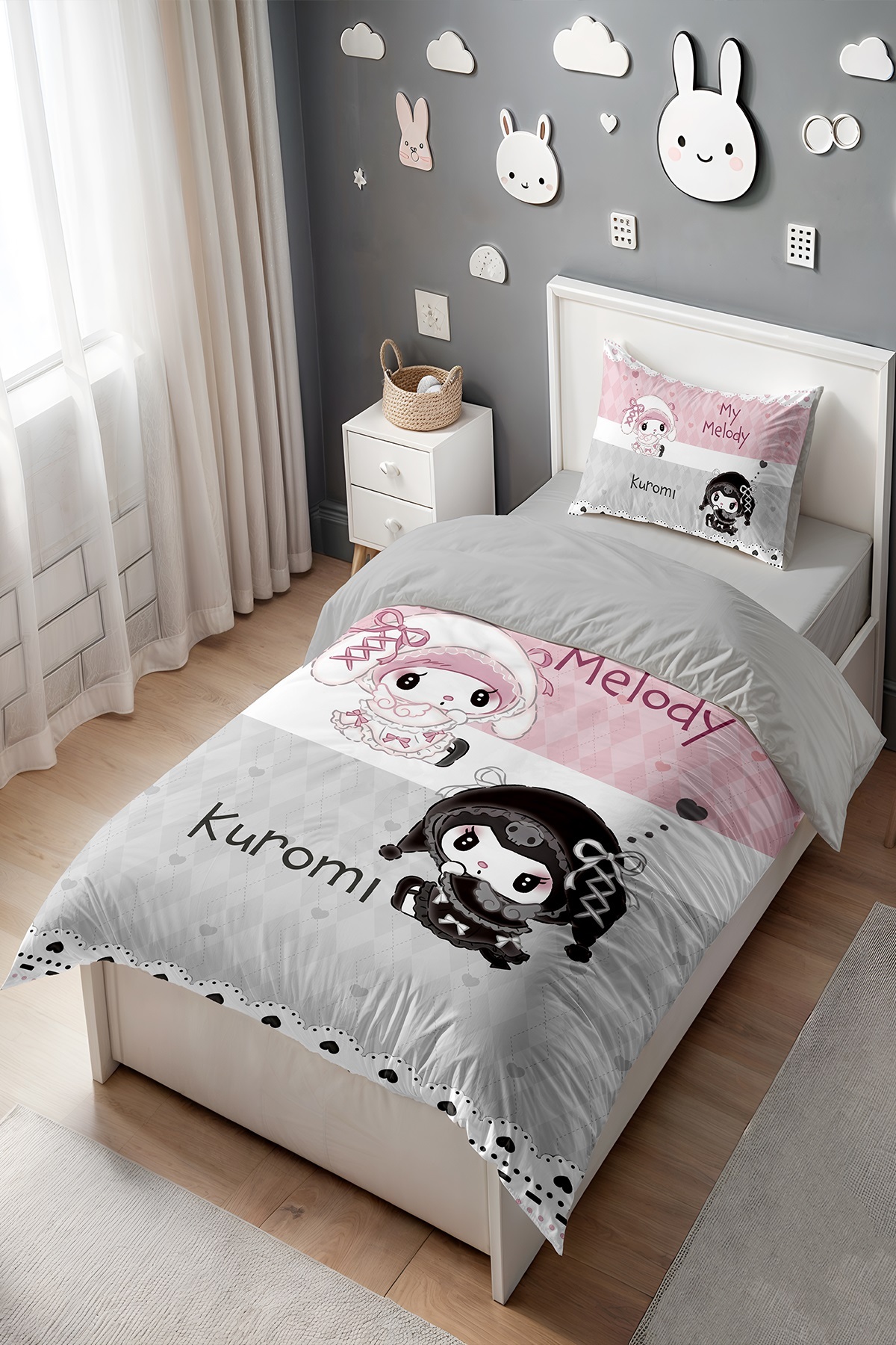 EVPANYA Pembe Gri Kalpler Kuromi ve My Melody Desenli Tek Kişilik Bebek Çocuk Nevresim Seti