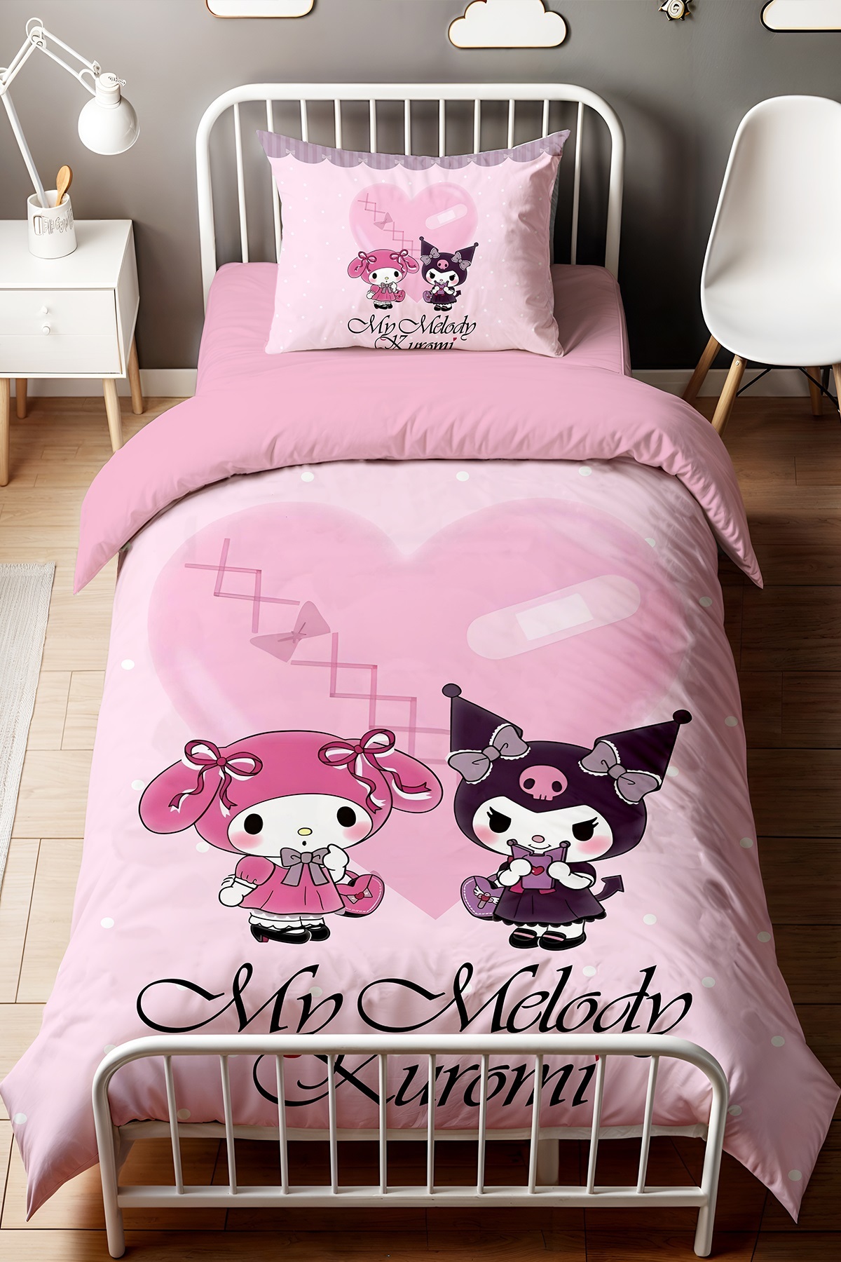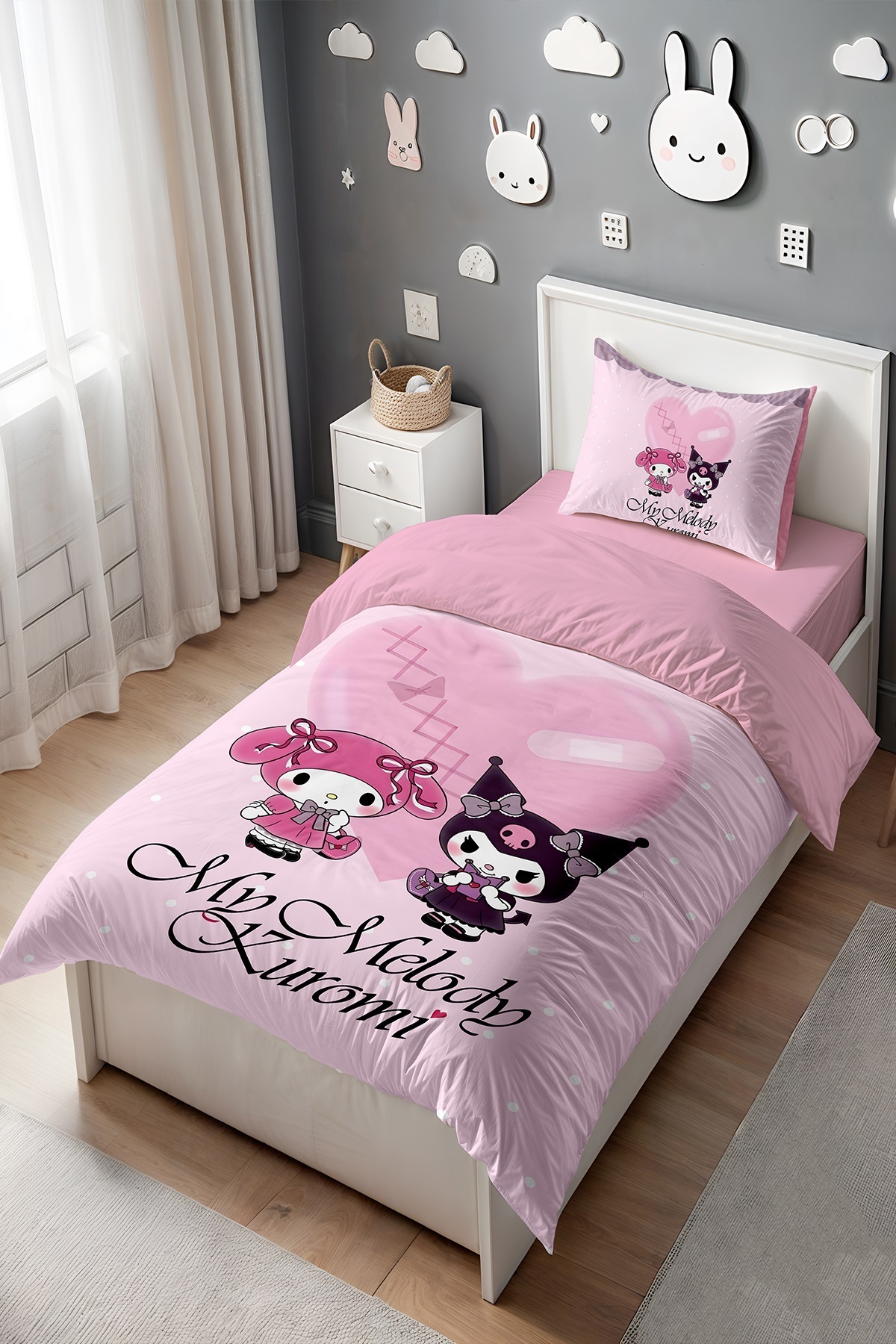 EVPANYA Pembe Puantiyeli My Melody ve Kuromi Desenli Tek Kişilik Bebek Çocuk Nevresim Seti
