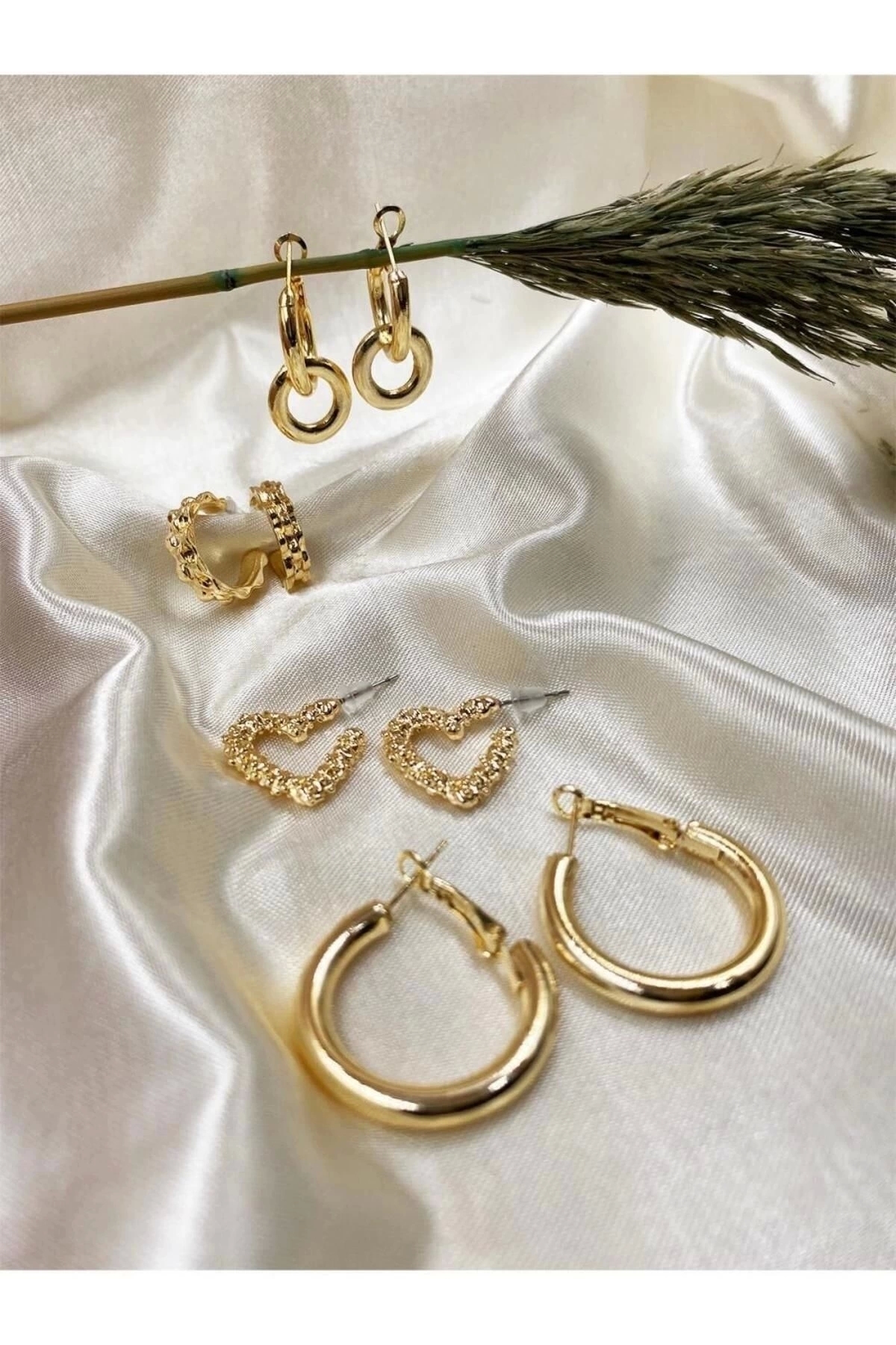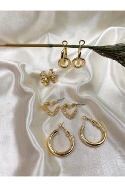 Eylülün Takısı Altın Rengi 4 Çift Kalpli,Salltantılı,Klipsli Ve Tasarım Küpe