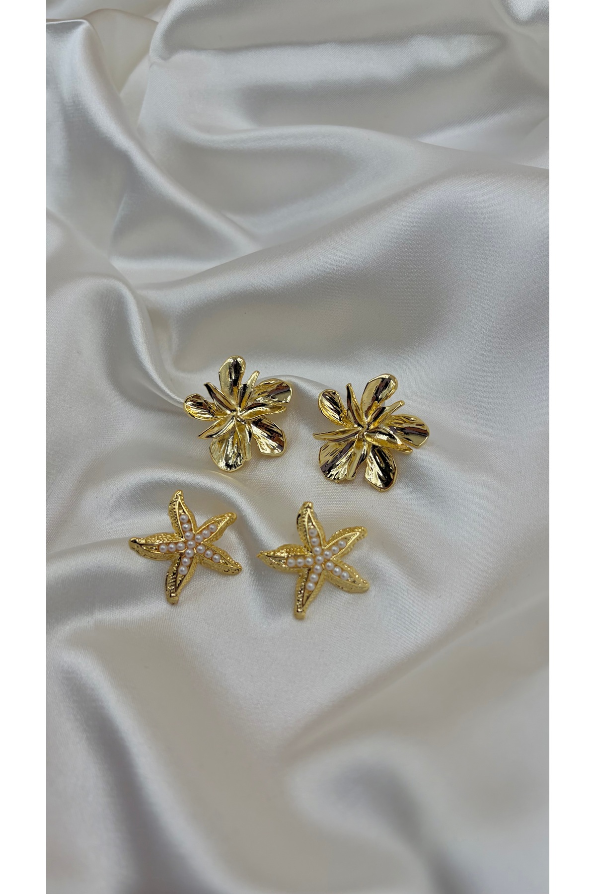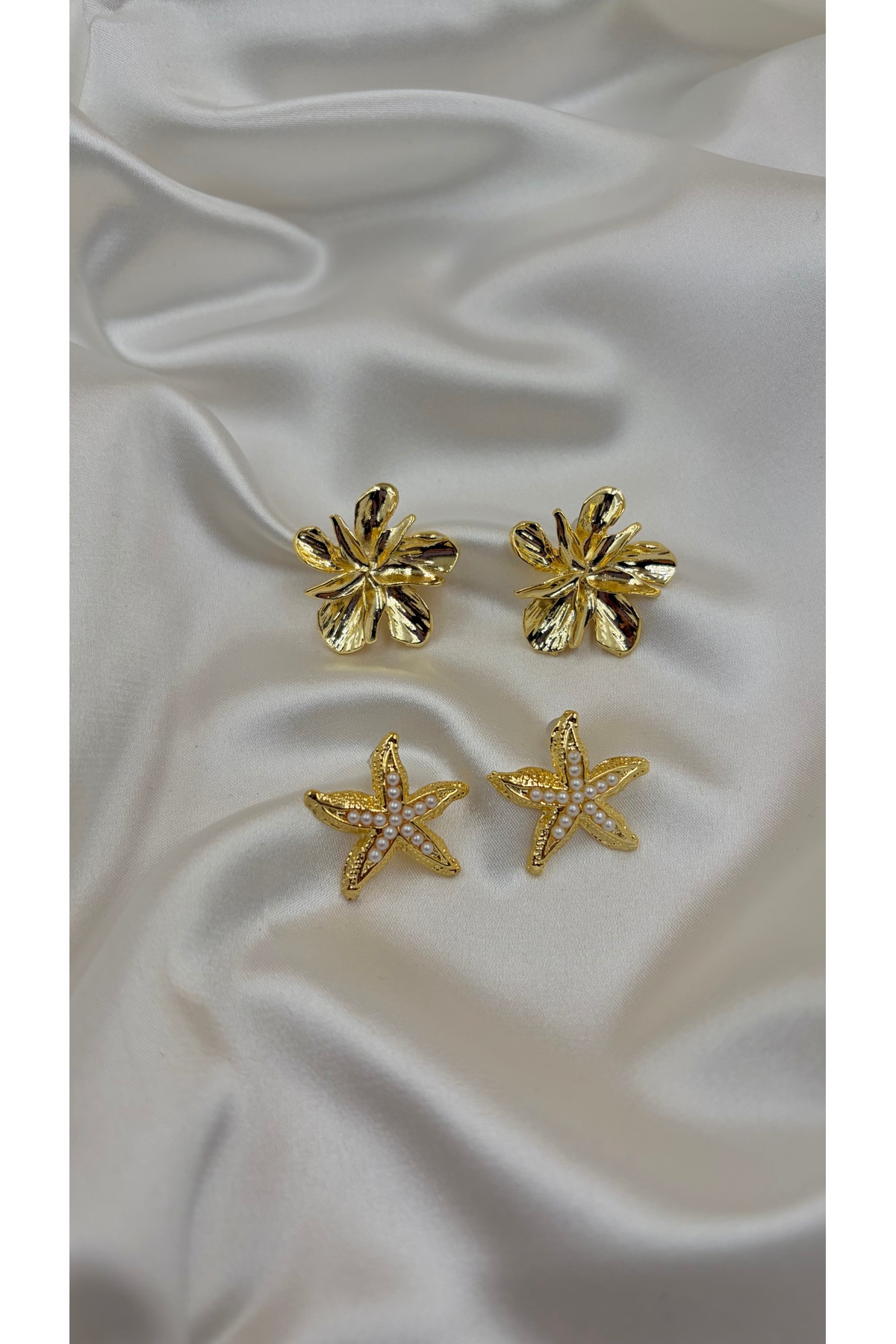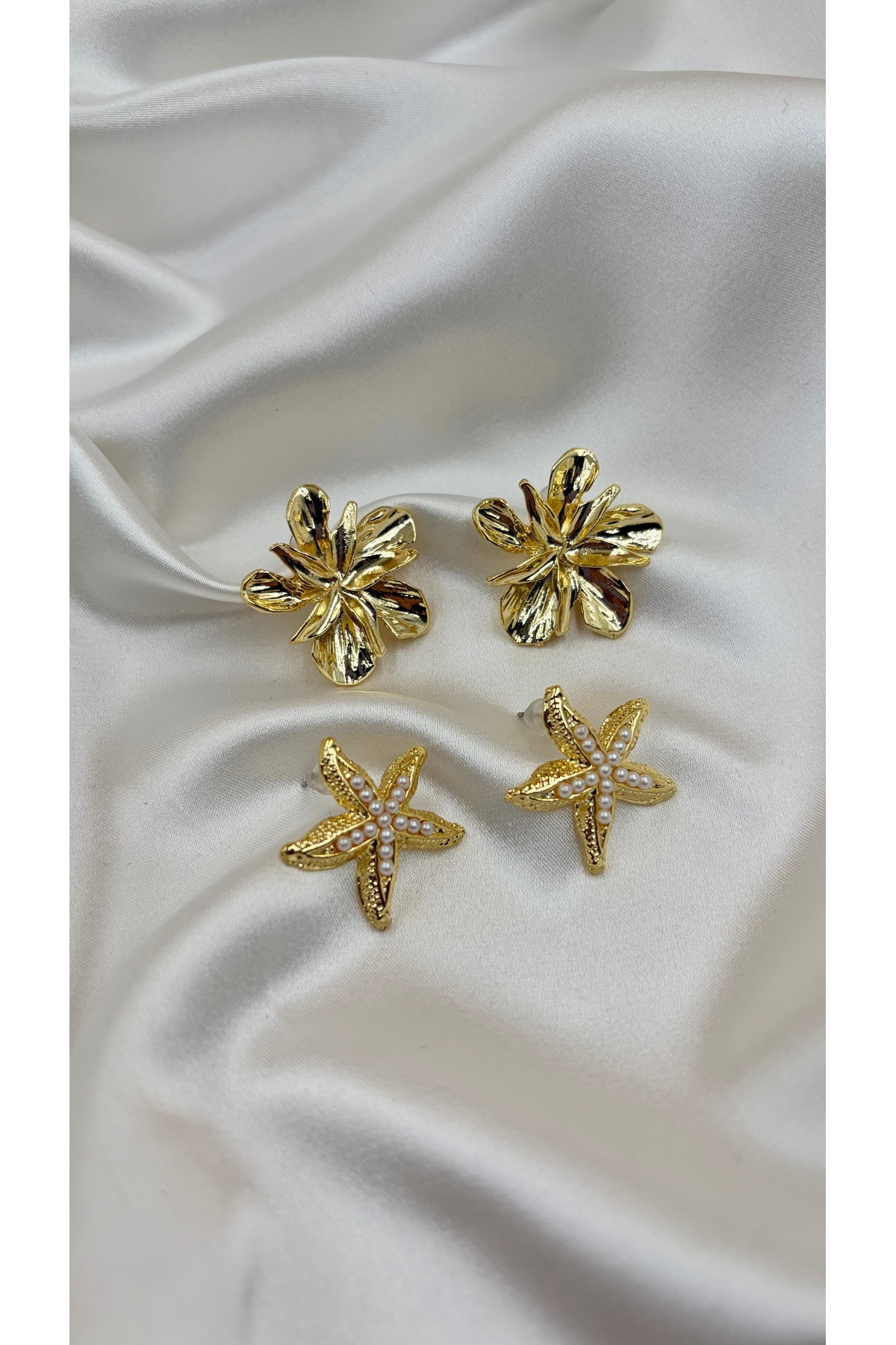 Eylülün Takısı Kadın Gold Renk 2’li Set Çiçek ve Deniz Yıldızı Küpe