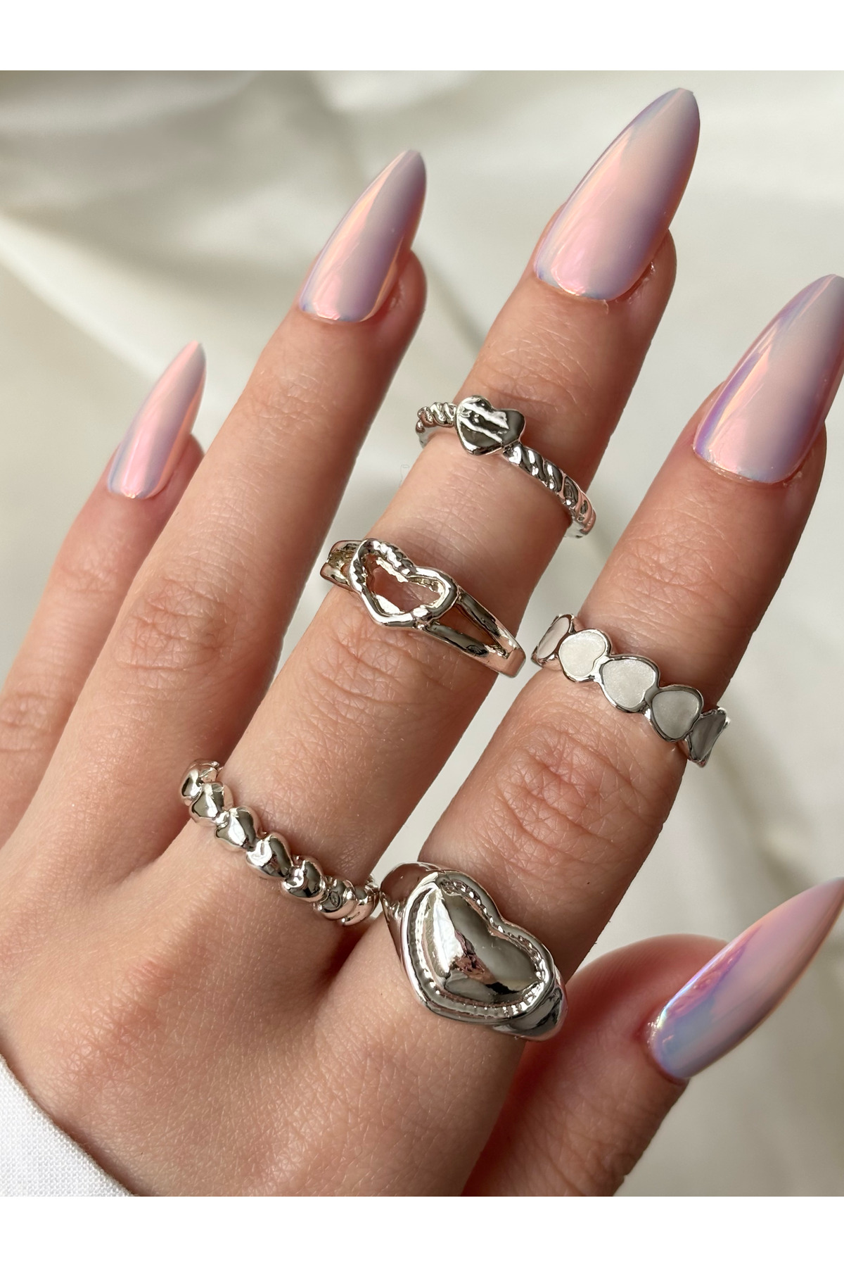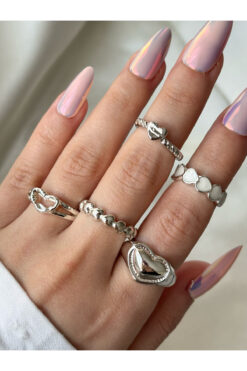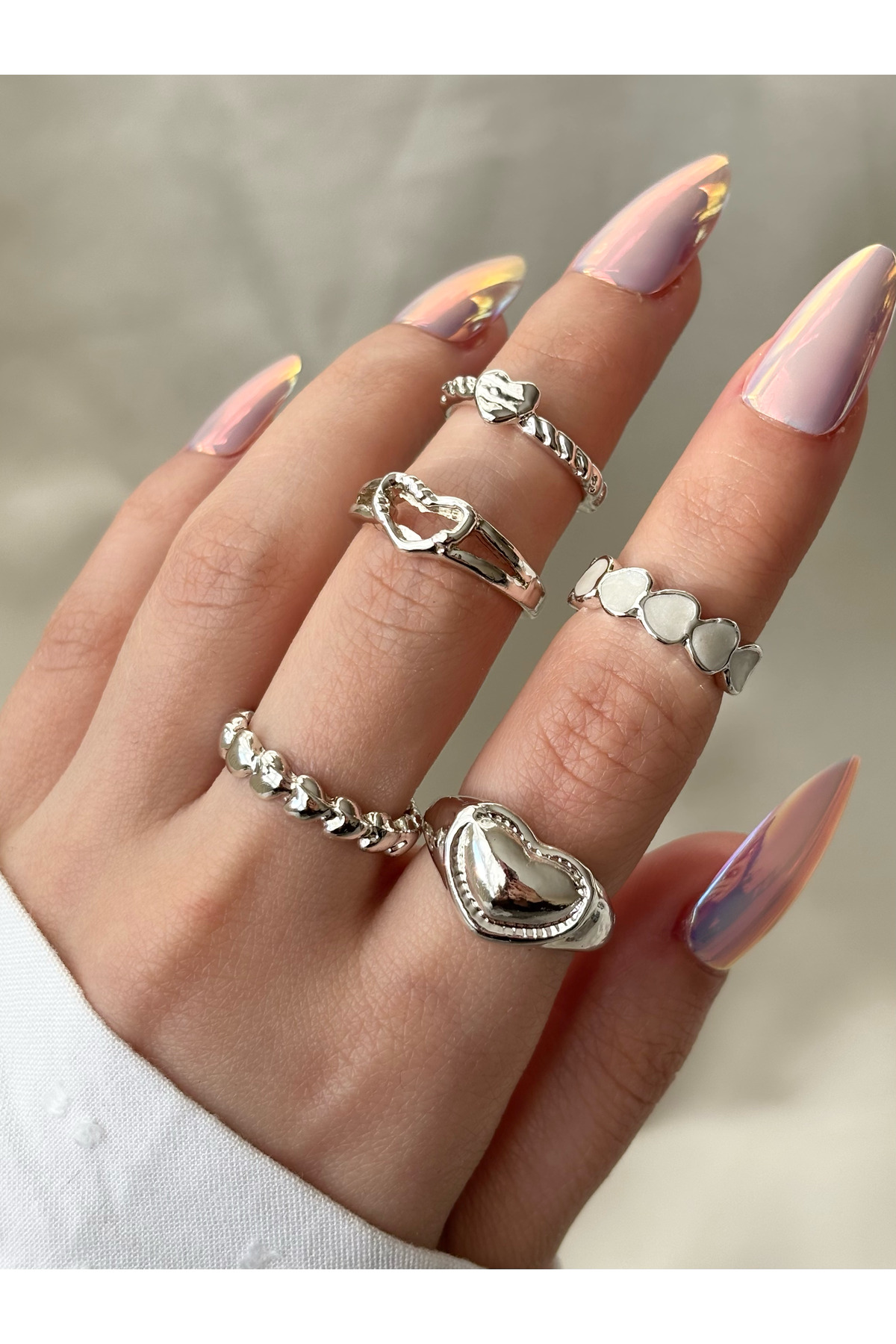 Eylülün Takısı Kadın Gümüş Renk 5 li Kalp Model Yüzük Seti