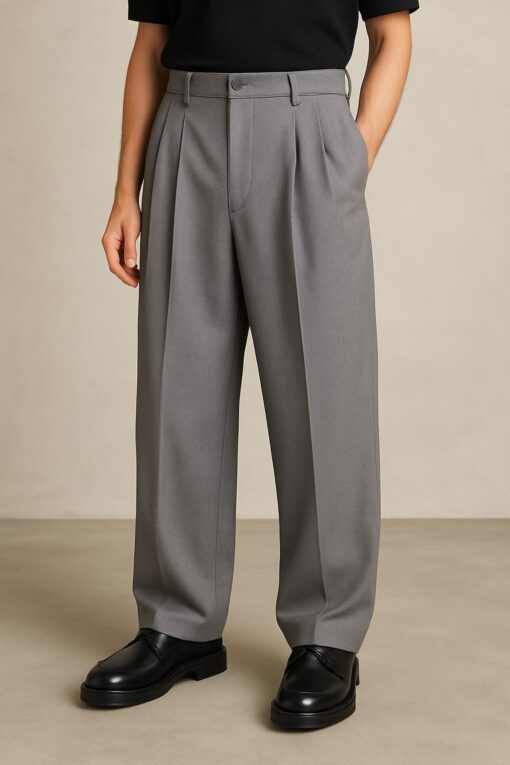 eywear Erkek Gri Renk Pileli Likralı Rahat Kalıp Bol Kesim Baggy Kumaş Pantolon