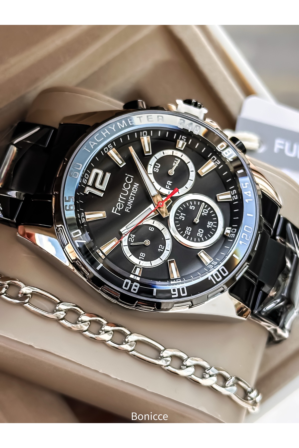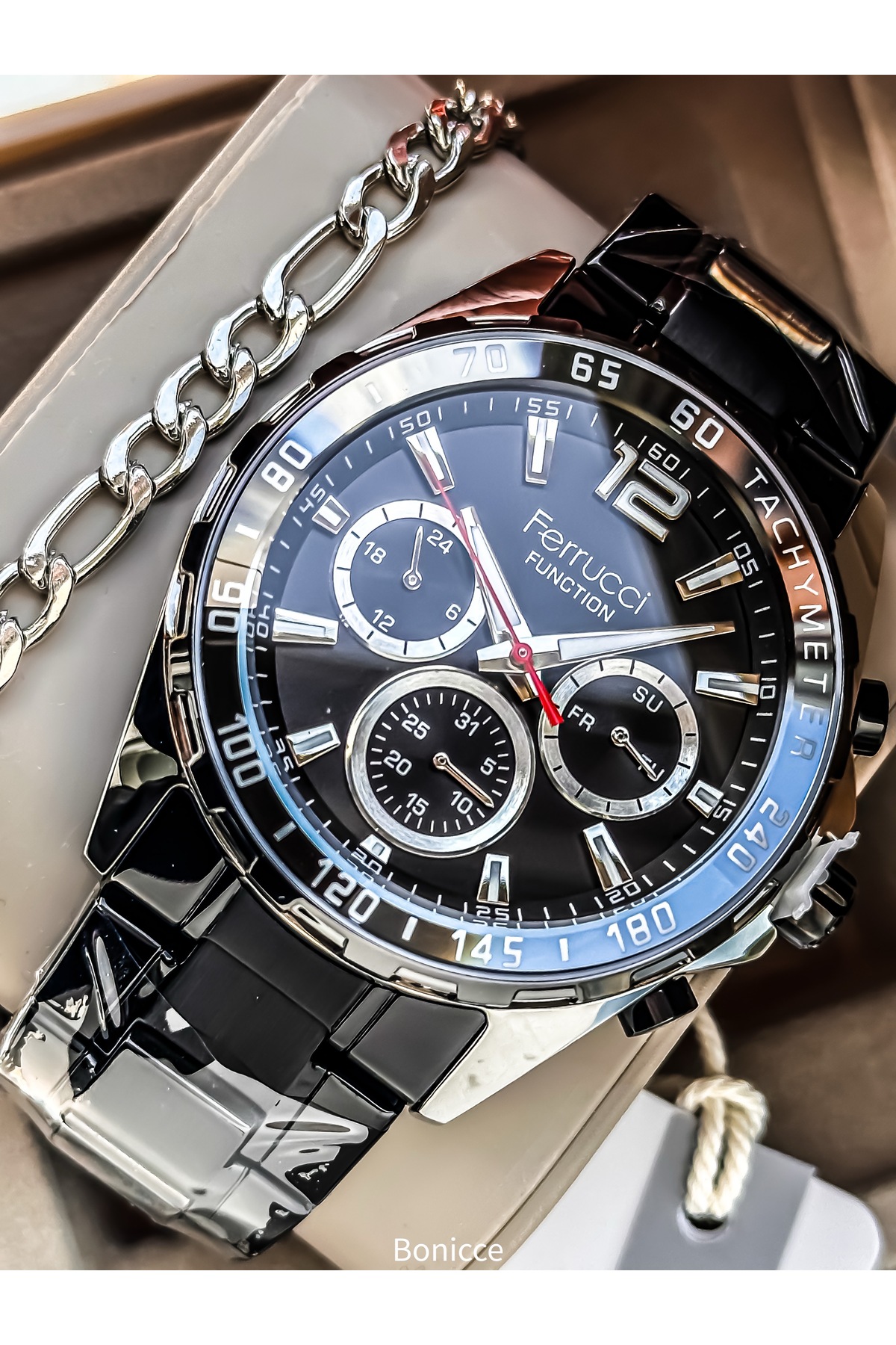 Ferrucci Erkek Kol Saati, Takvimli Fonksiyonları Aktif, Siyah Çelik Kordon, Siyah Kadran + Bileklik