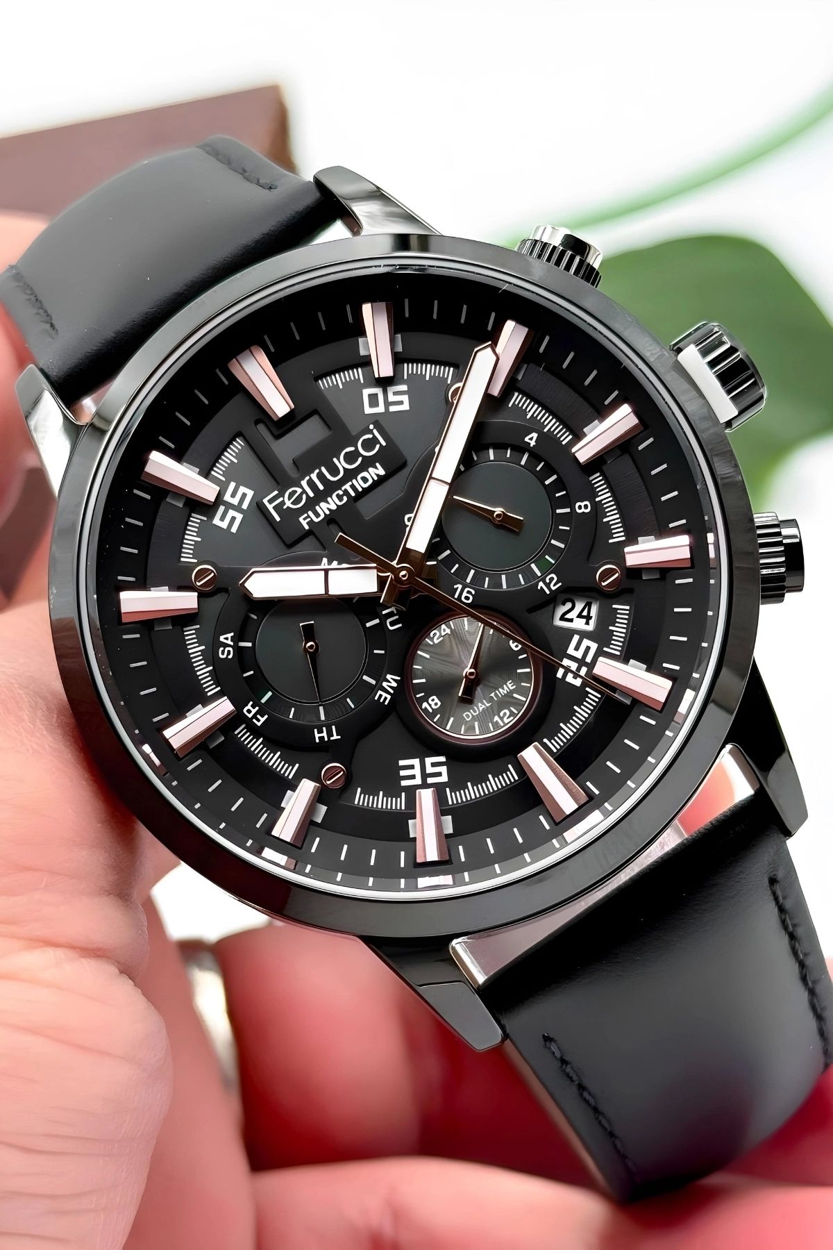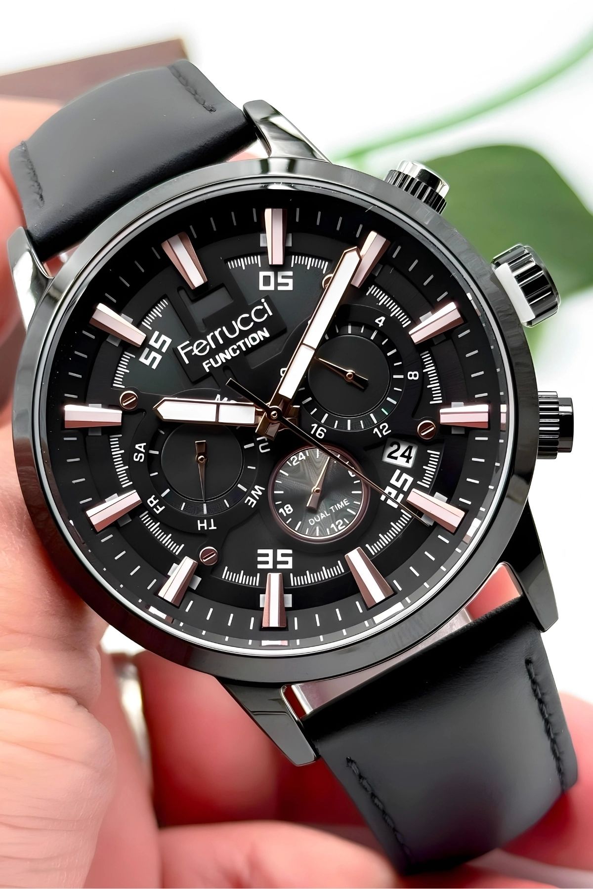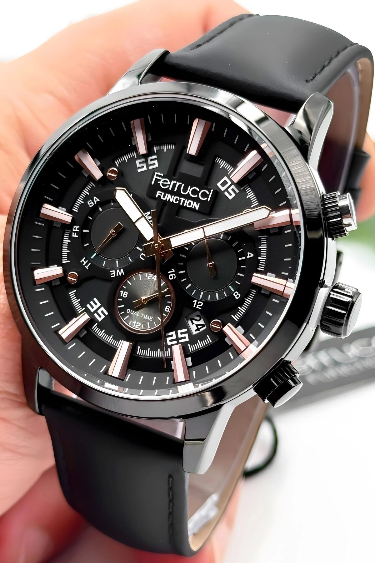 “Ferrucci Marka Fonksiyonlar ve Takvim Aktif Siyah Renk Deri Kordonlu Erkek Kol Saati, şıklığı ve işlevselliği bir araya getirerek erkekler için özel bir seçenektir.