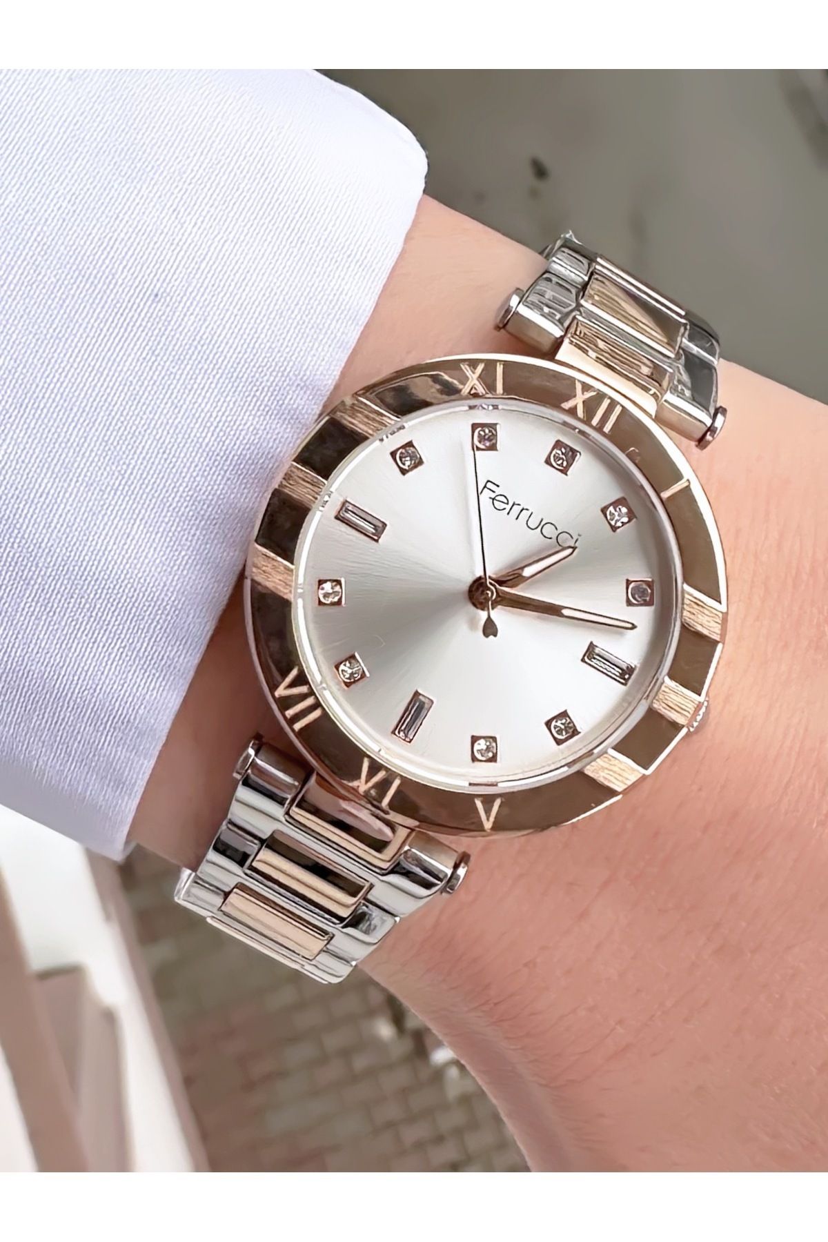 Ferrucci Kadın Gümüş Altın Taşlı Kadran Metal Kordon Kol Saati – Romen Rakamlı Zarif Çerçeve