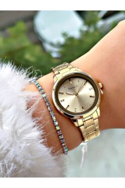 Altın rengi kasa, zarif görünümüyle her türlü kıyafetle uyum sağlar ve sofistike bir dokunuş katar