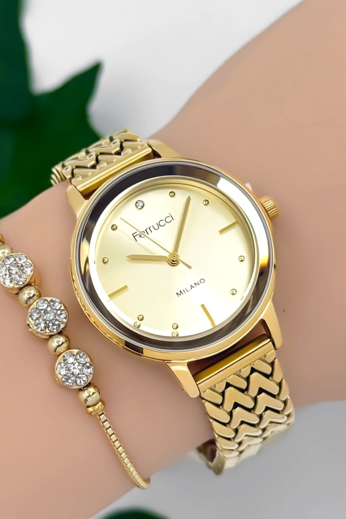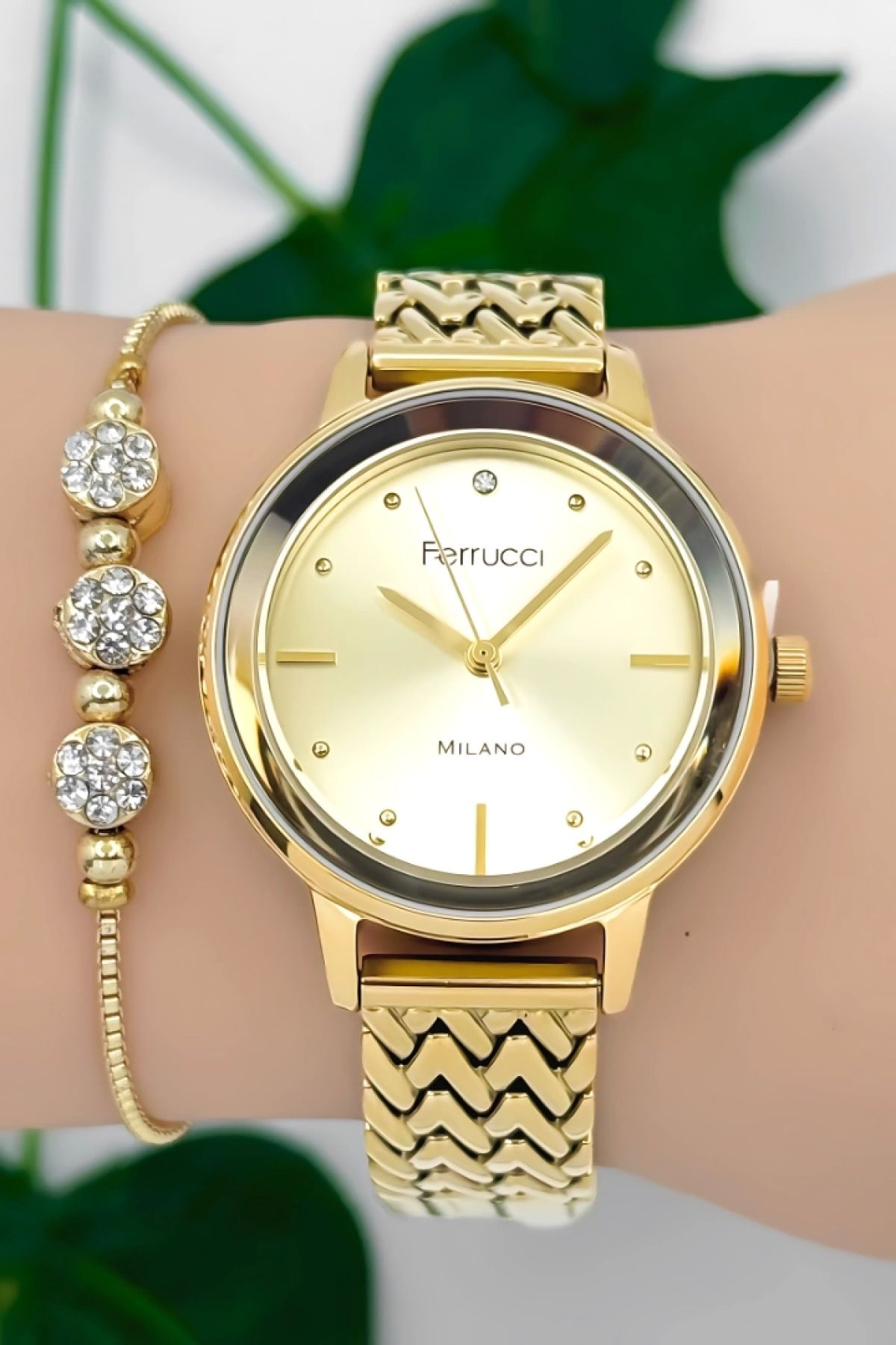 Ferrucci Kadın Kol Saati Çelik Kordon Çelik Kasa Taşlı Bileklik Hediyesi Ile Gold Zmfer045