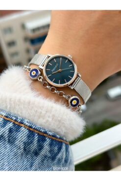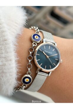 Ferrucci Marka Gümüş Renk Çelik Hasır Kordon Lacivert Kadran Mini Kasa Kadın Kol Saati +Bileklik