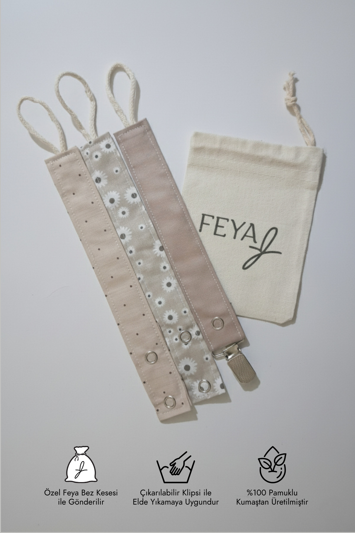 Feya Vika 3’lü Nokta, Papatya Desenli & Düz Pamuklu Yıkanabilir Emzik Askısı – Bej, Taş Rengi