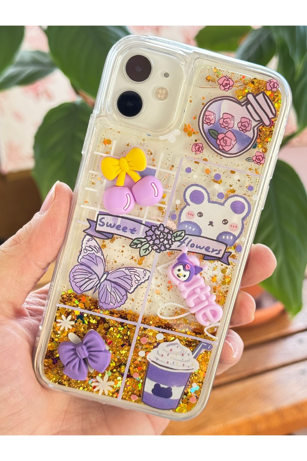 Fibaks Apple iPhone 11 Kılıf Renkli Kurdale Kelebek Kedi Figürlü Sıvılı Mor Renkli Kapak