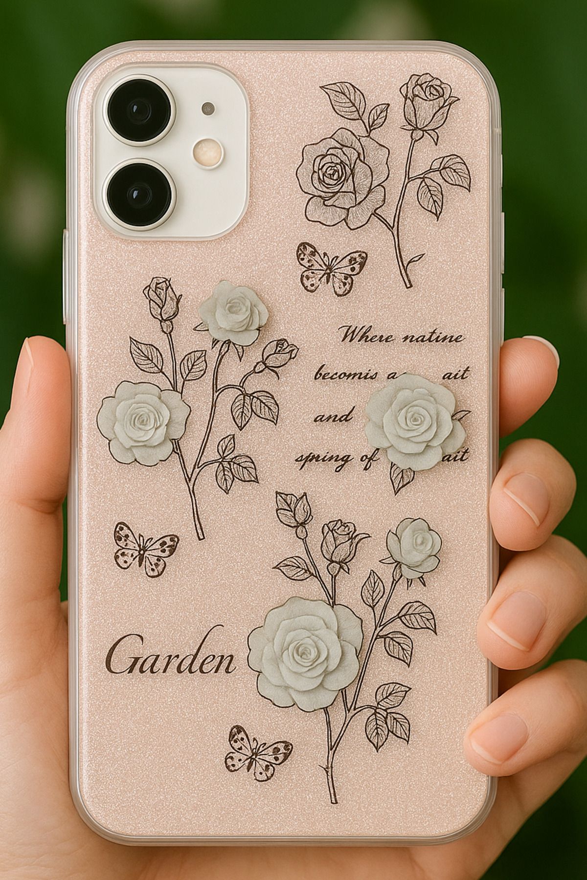 Apple iPhone 11 Uyumlu Kılıf Simli Beyaz Gül Desenli Renkli Parlak Darbe Emici Kapak
