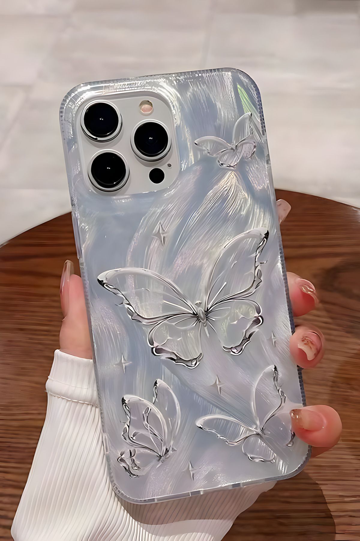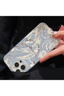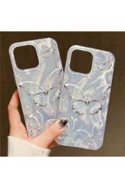 Apple iPhone 12 Pro Max modellerine özel tasarlanmış, telefonunuzu darbelere ve çizilmelere karşı koruyan parlak beyaz kelebek desenli kılıf.