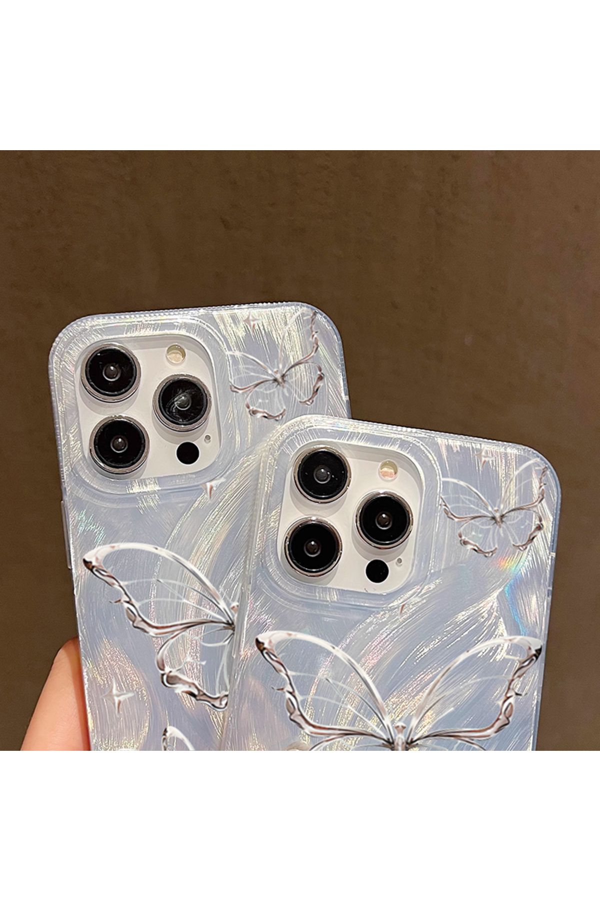 Fibaks Apple iPhone 12 Pro Max Kılıf Parlak Hologramlı Kelebek Desenli Darbe Emici Kamera Korumalı Silikon