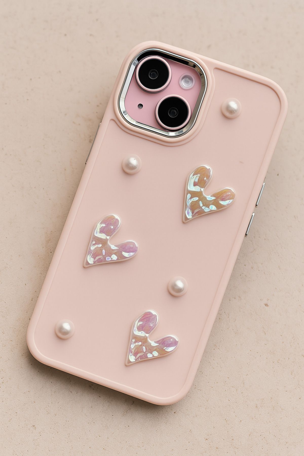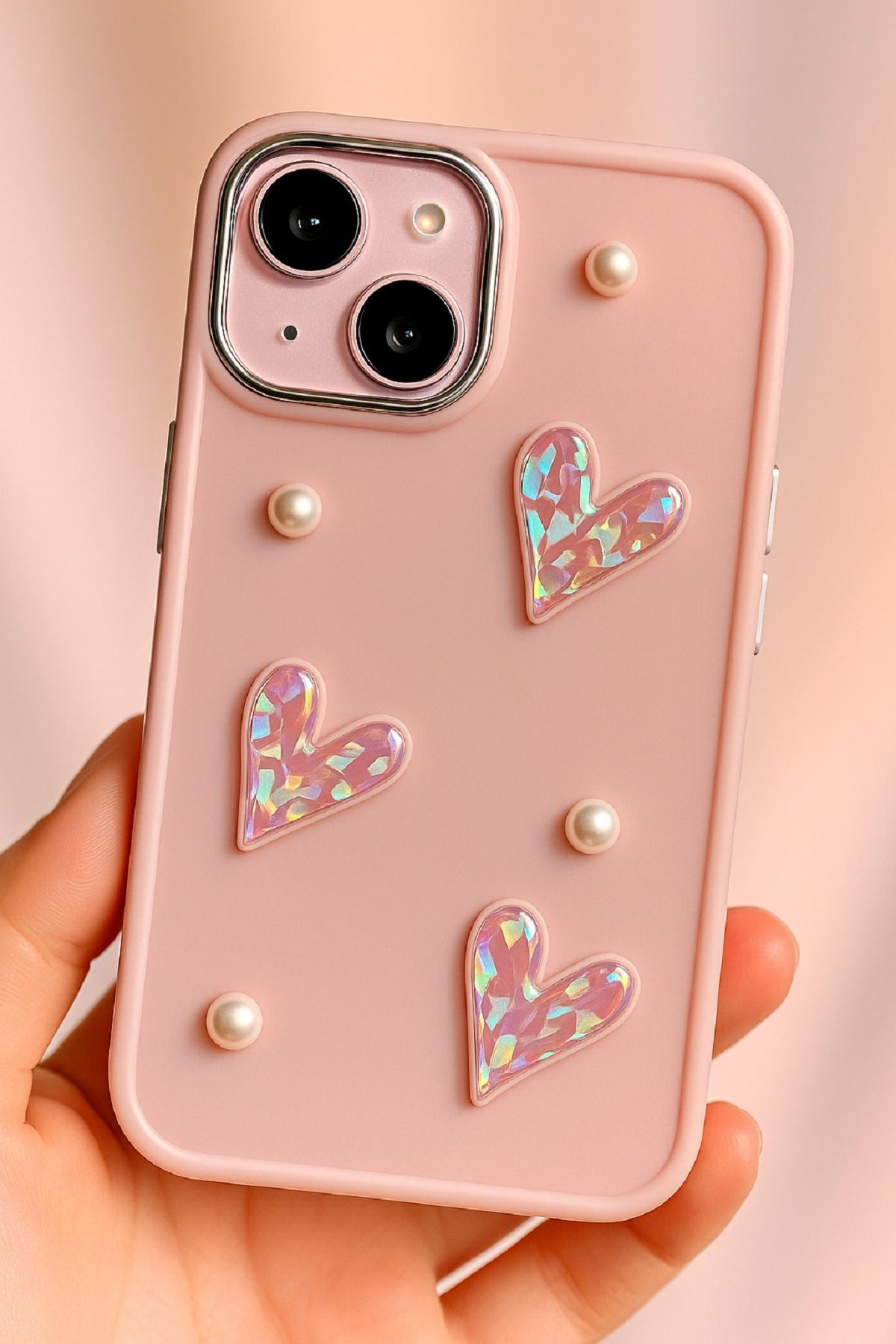 Fibaks Apple Iphone 13 – 14 – 15 Kılıf Kamera Çıkıntılı Fiyonk Inci Desenli Pembe Yumuşak Silikon Kapak