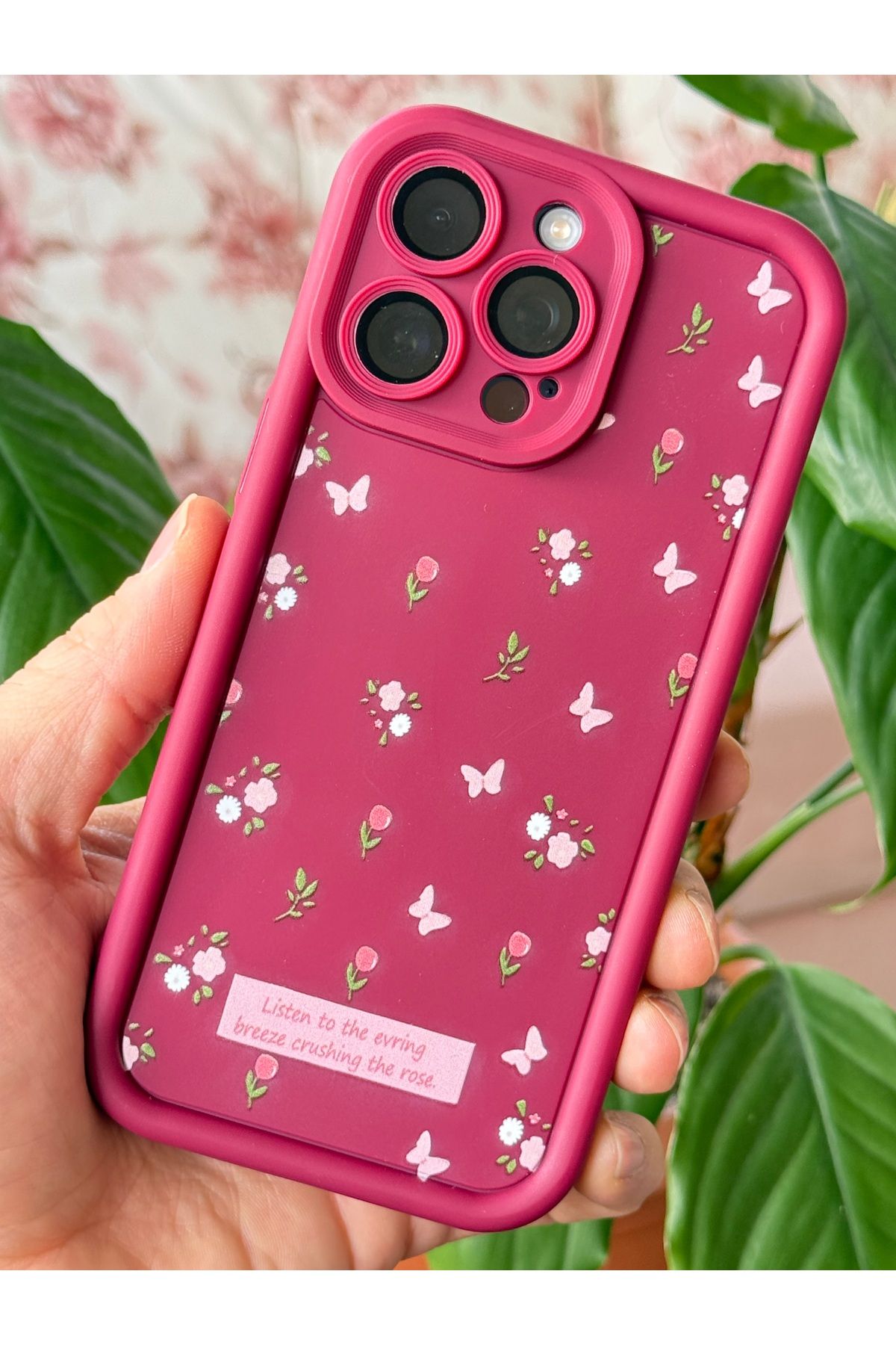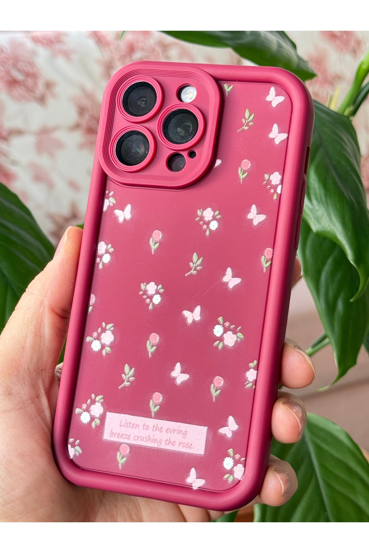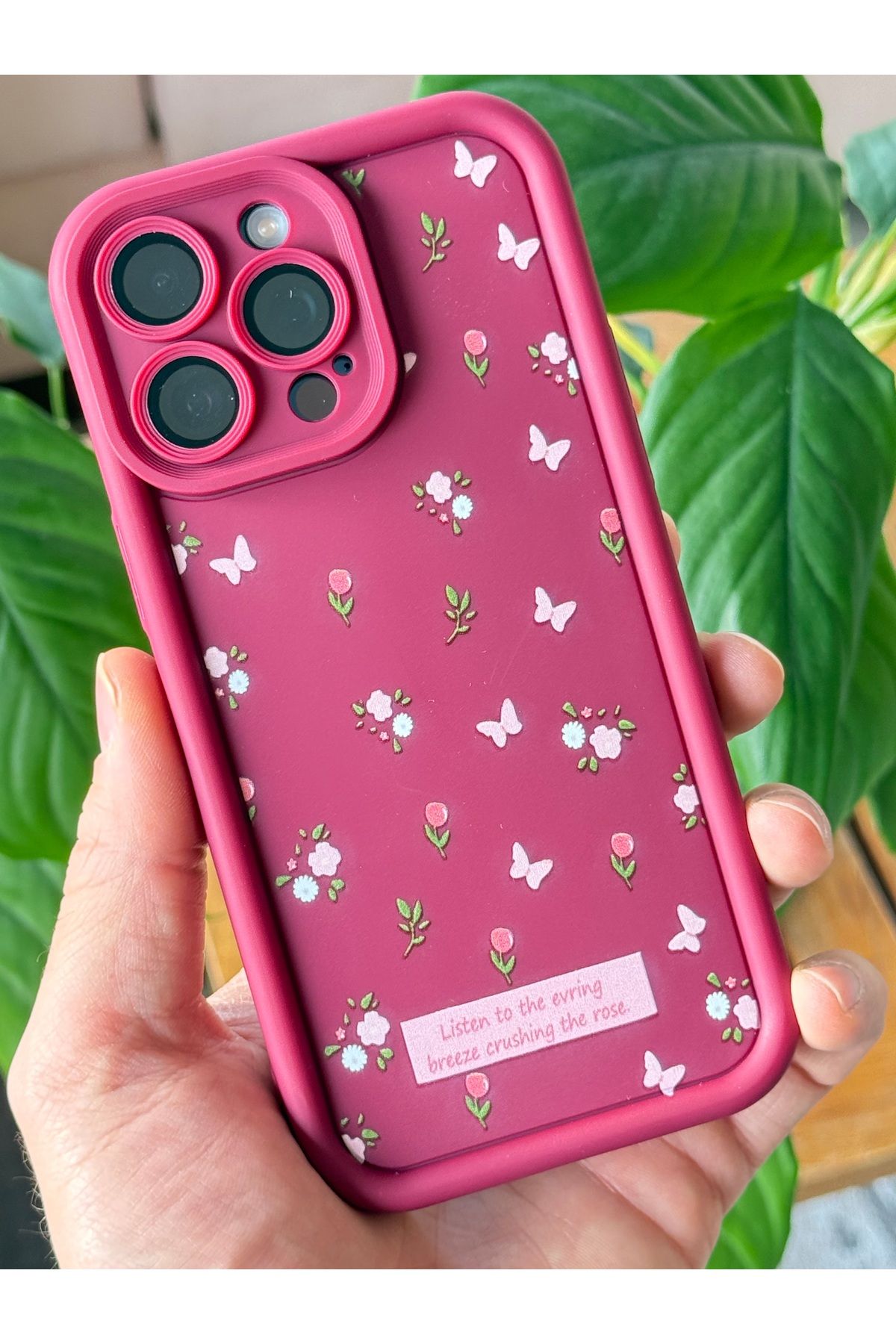 Apple iPhone 14 Pro Max modelinize özel tasarlanmış, yumuşak dokulu kelebek ve gül desenleriyle süslenmiş silikon kapak.