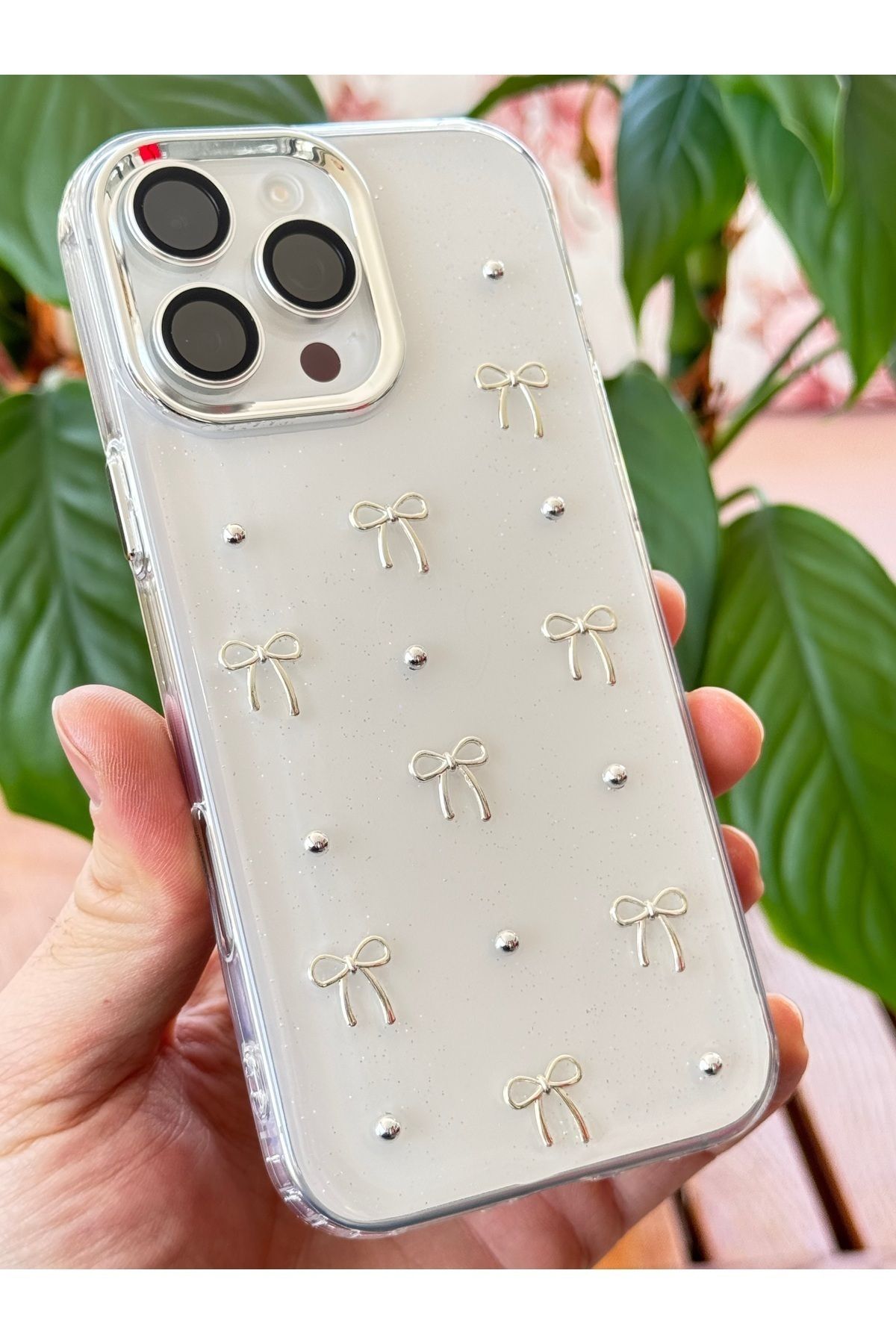 Fibaks Apple iPhone 15 Pro Max Kılıf Fiyonk Desenli Şeffaf Simli Gümüş Kamera Çıkıntılı Parlak Kapak ürününü en uygun fiyata kozmetikara.com sitemizden sipariş verebilirsiniz.