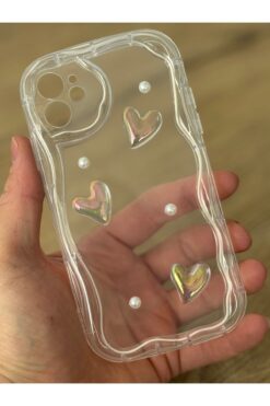 Fibaks İphone 12 Kılıf Tasarımlı Desenli Kamera Korumalı 3d Kalpli Ve Inci Tasarımlı Şeffaf Silikon Kapak