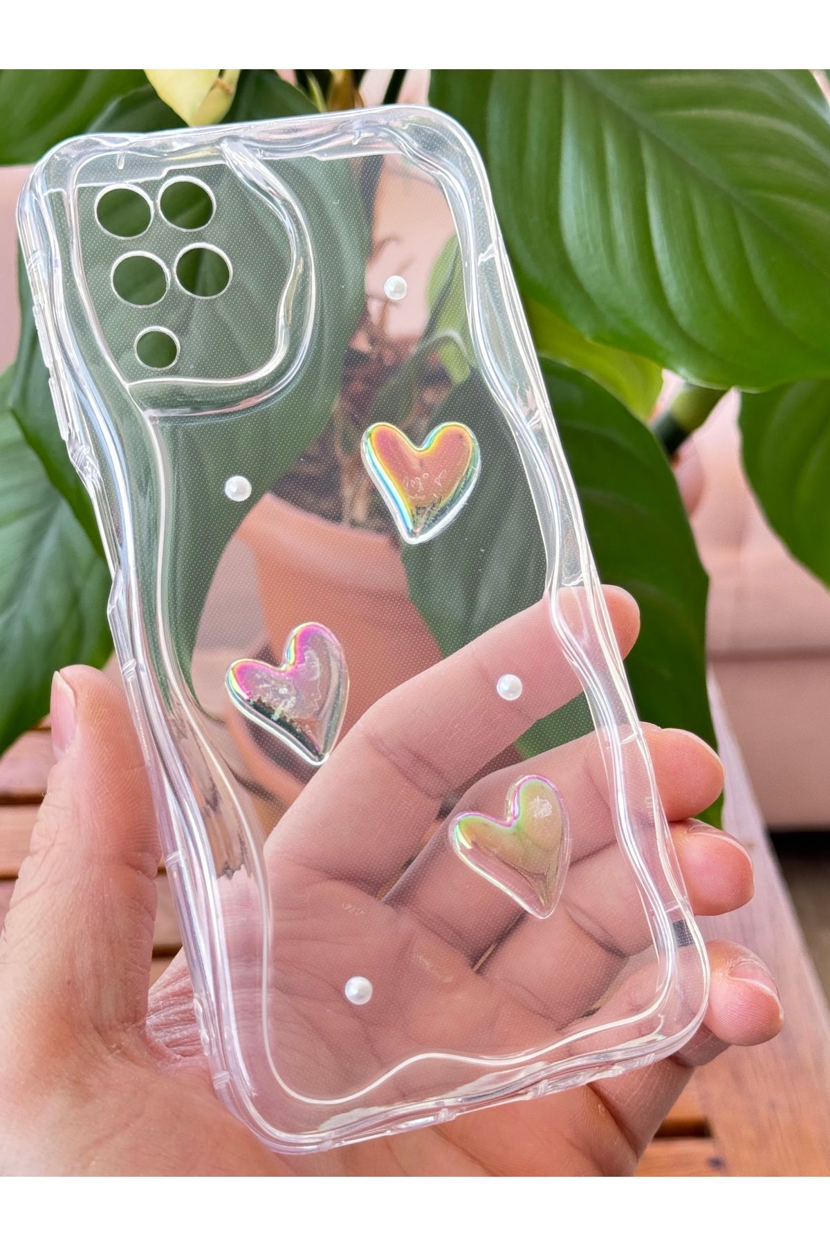 Fibaks Samsung Galaxy A12/M12 Kılıf 3D Kalpli İnci Tasarımlı Desenli Kamera Korumalı Şeffaf Silikon Kapak