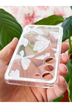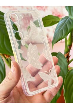 Samsung Galaxy S24 Plus modelinize özel tasarlanmış, telefonunuzu tam olarak saran şeffaf kelebek desenli kılıf.