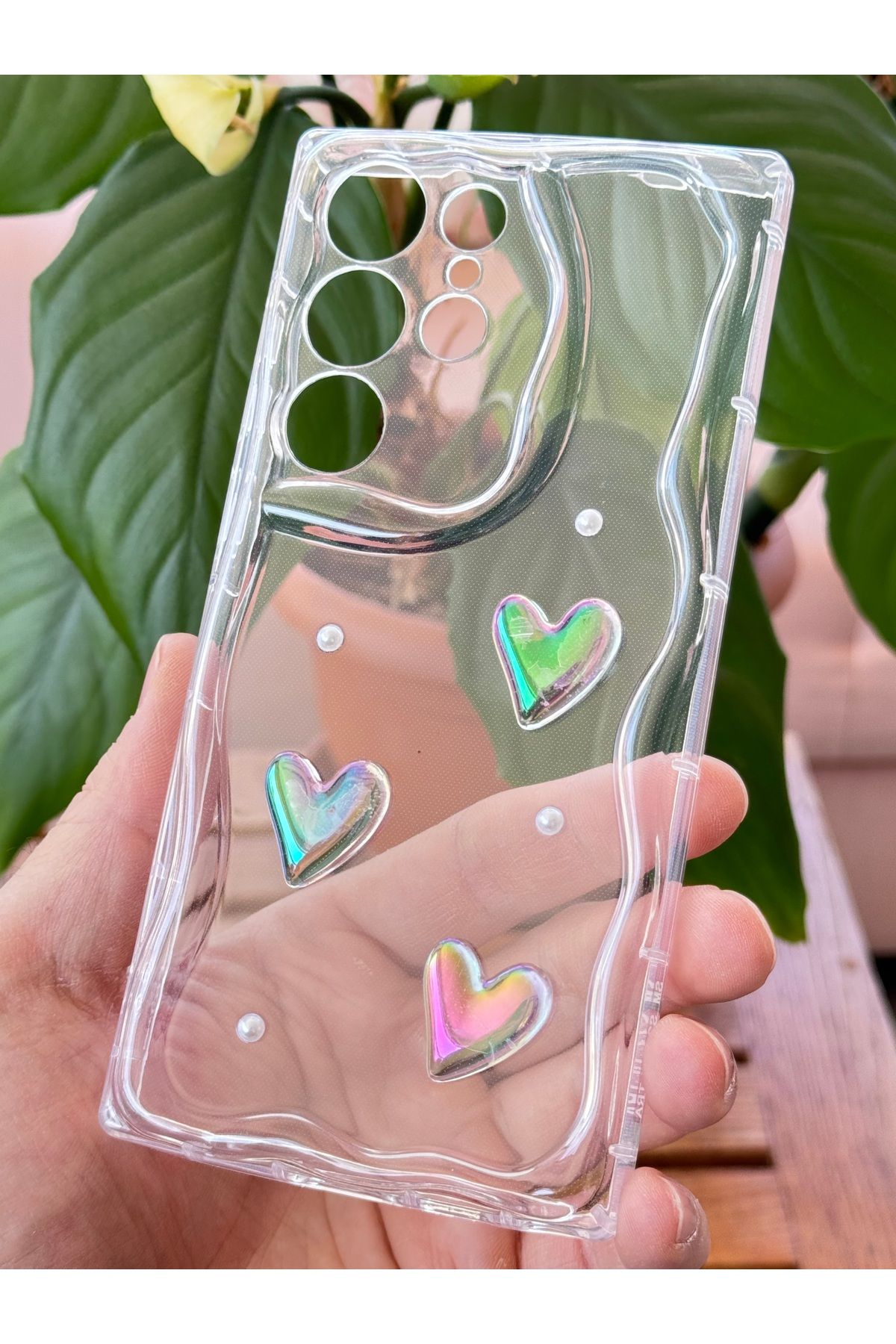 Fibaks Samsung Galaxy S25 Ultra Kılıf 3D Kalpli İnci Tasarımlı Desenli Kamera Korumalı Şeffaf Silikon Kapak