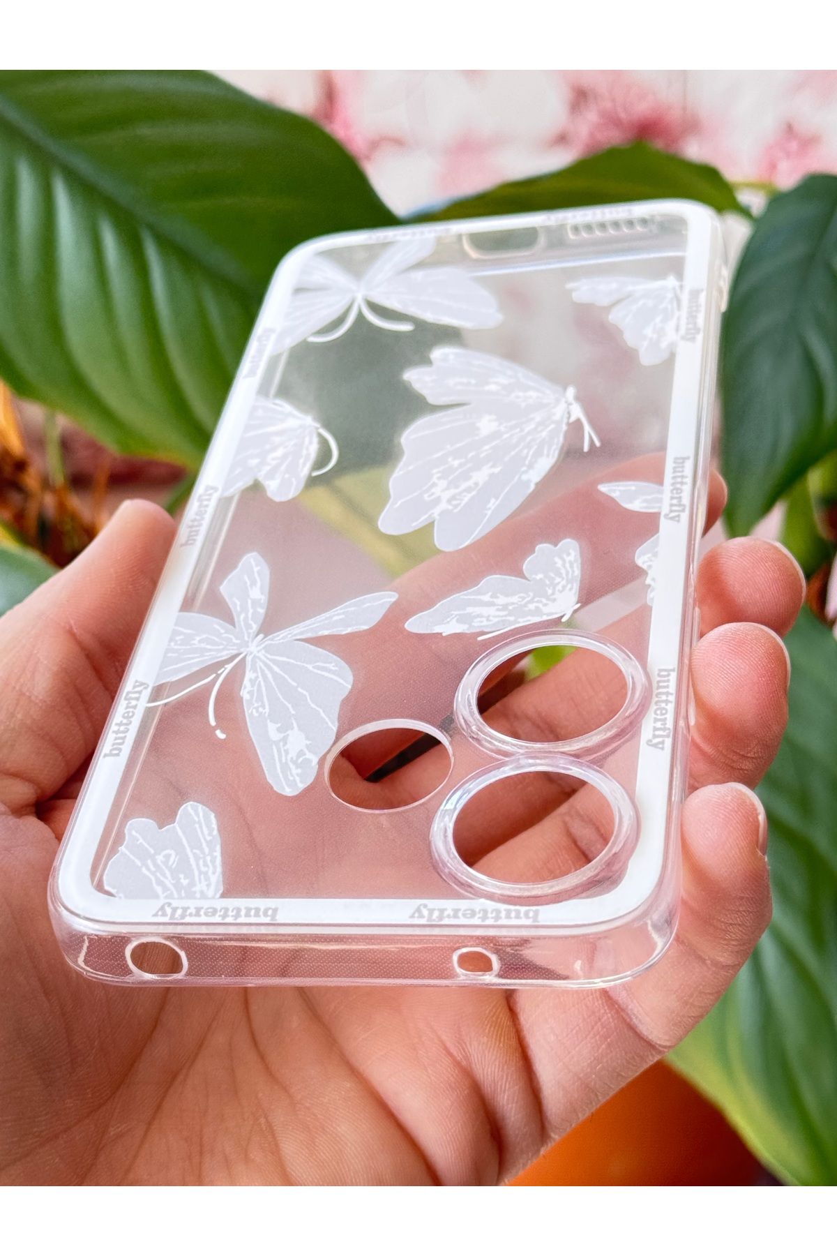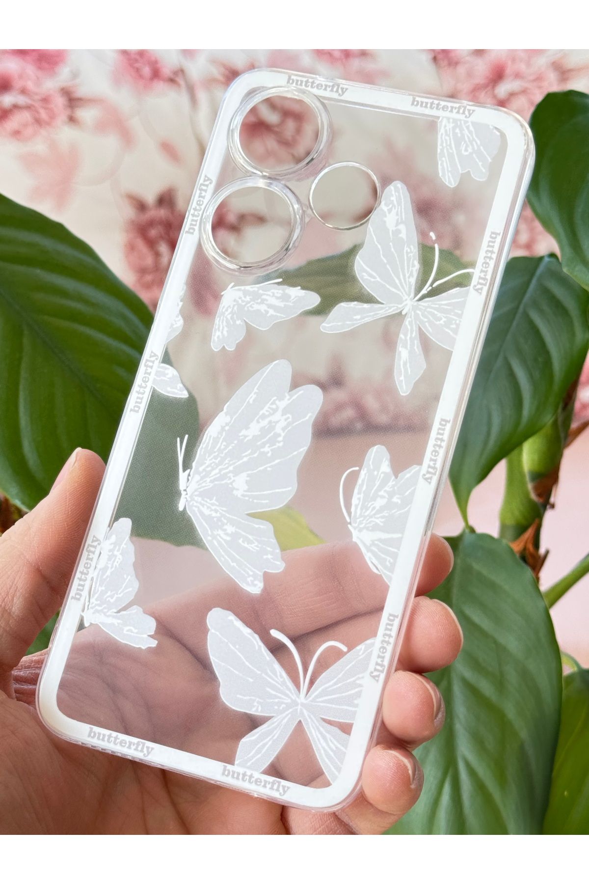 Xiaomi Redmi 13 modelinize özel tasarlanmış, telefonunuzu tam olarak saran şeffaf kelebek desenli kılıf.