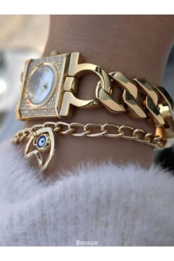 Fiesta 2yıl Garantili Altın Sarısı Çelik Kordon Gelin, Nişan, Düğün Gelin Taşlı Kol Saati Bileklik