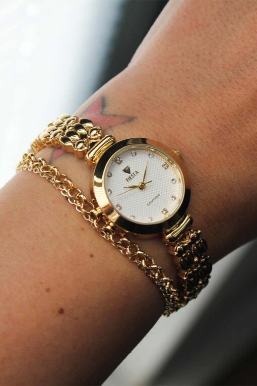 Fiesta 2yıl Garantili Altın Sarısı Çelik Kordon Gelin, Nişan, Düğün Gelin Taşlı Kol Saati Bileklik