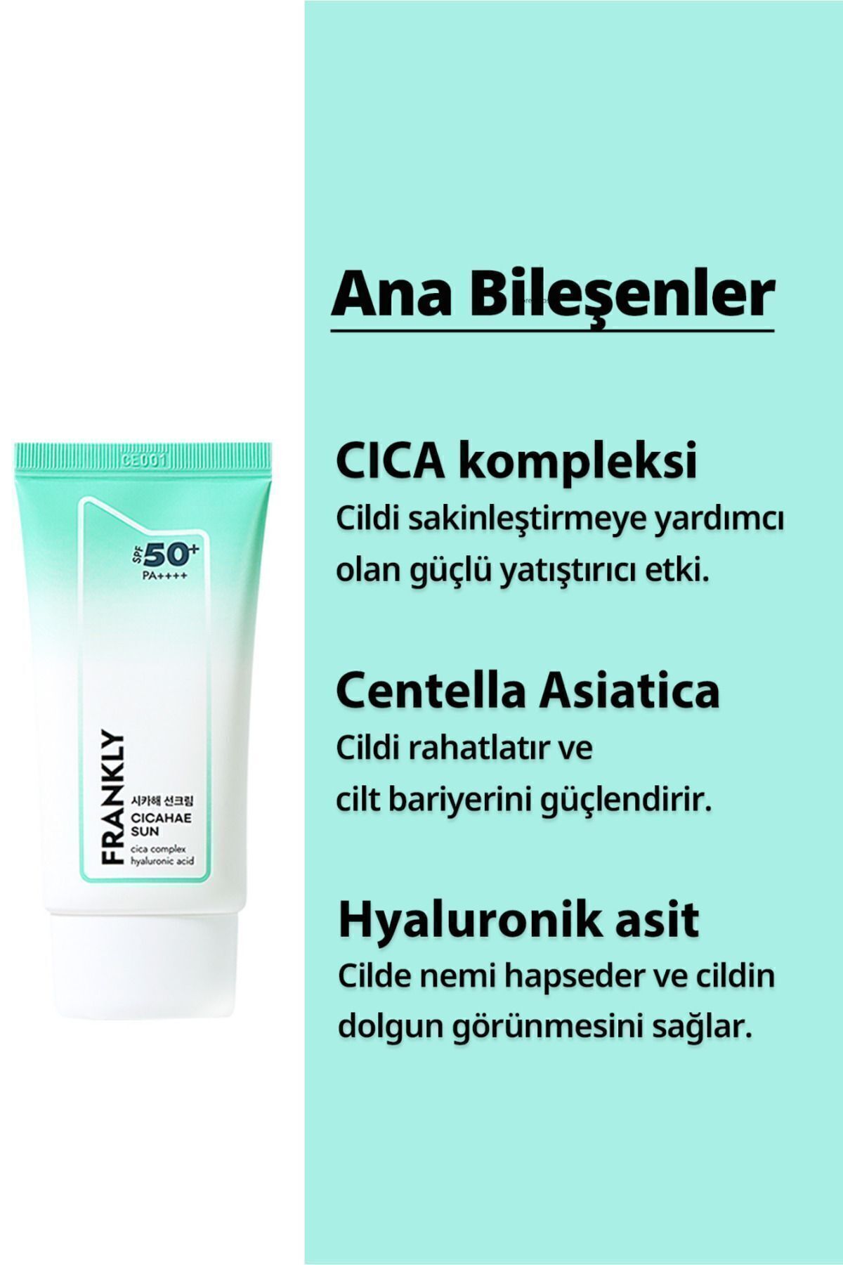 FRANKLY Centella Asiatica İçeren Nemlendirici CICAHAE Güneş Kremi SPF50+ PA++++ 50 ml