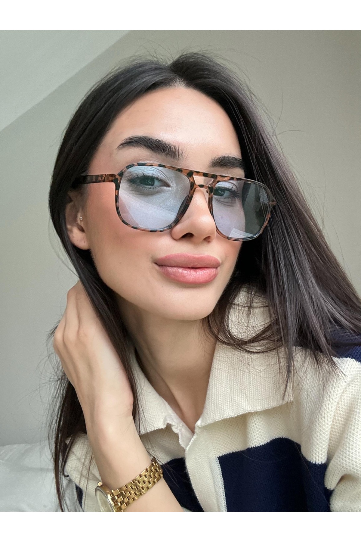 funeyes Mavi Camlı Nantes Leopar desenli unisex ince çift köprülü güneş gözlüğü