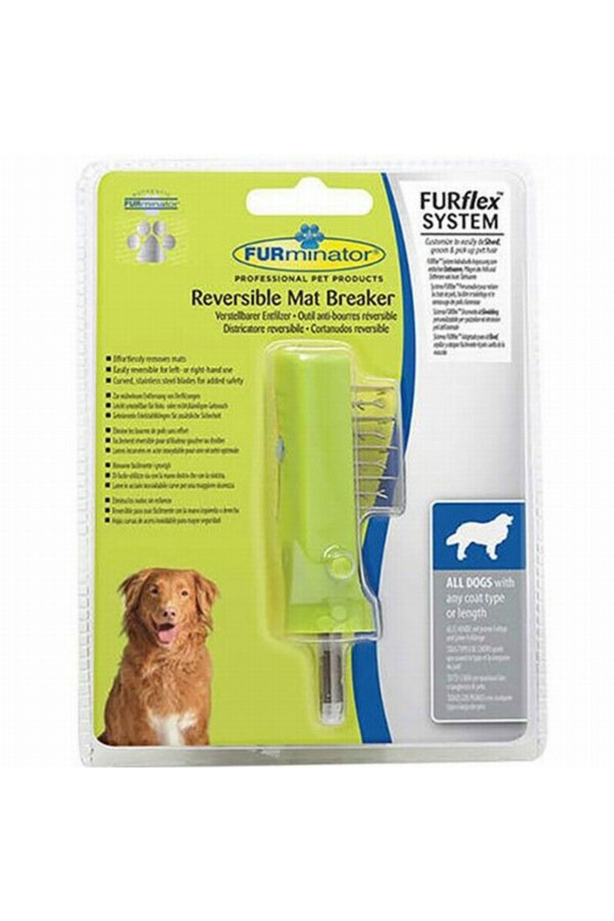 FURflex ™ Geri Dönüşümlü Mat Kesici, hem uzun hem kısa tüylü ırklarda rahatsız edici paspasları çıkarırTersinir bıçak hareketi sağ ve sol elini kullanabilmeyi sağlar ve evcil hayvanın her iki yanından damadın çırpılmasını sağlar.