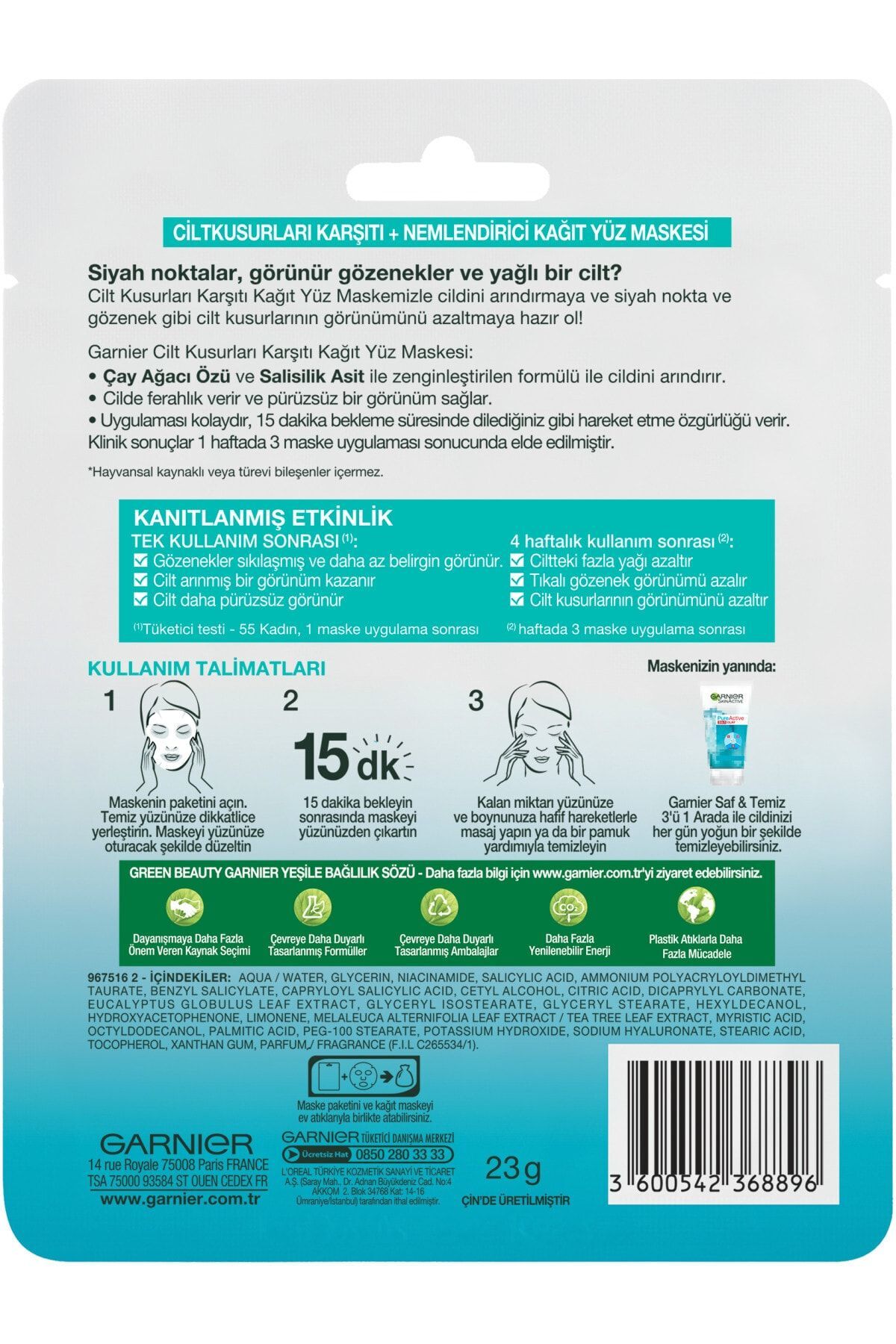 Garnier Saf&temiz Cilt Kusurları Karşıtı Kağıt Yüz Maskesi