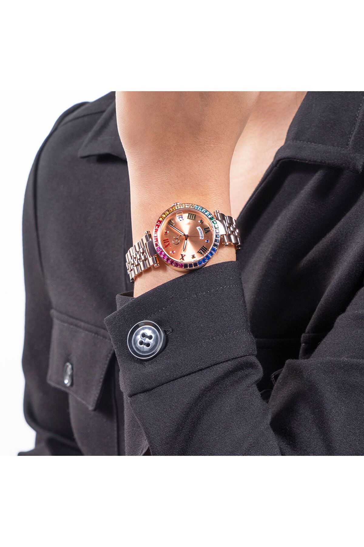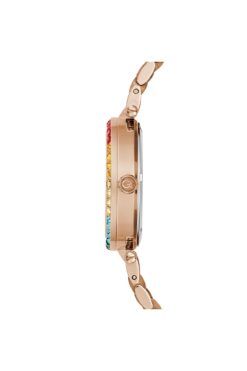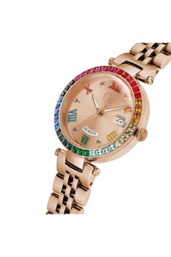 kadran rengi rose gold olan saat, zarif taşlarla süslenmiş kadranı ile göz alıcı bir görünüm sunar.