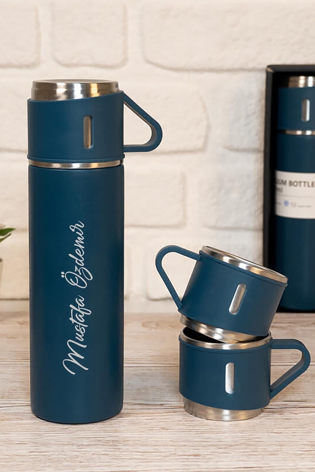 Genel Markalar Kişiye Isme Özel Üçlü Bardak Paslanmaz Çelik Termos Seti 500ml Lacivert