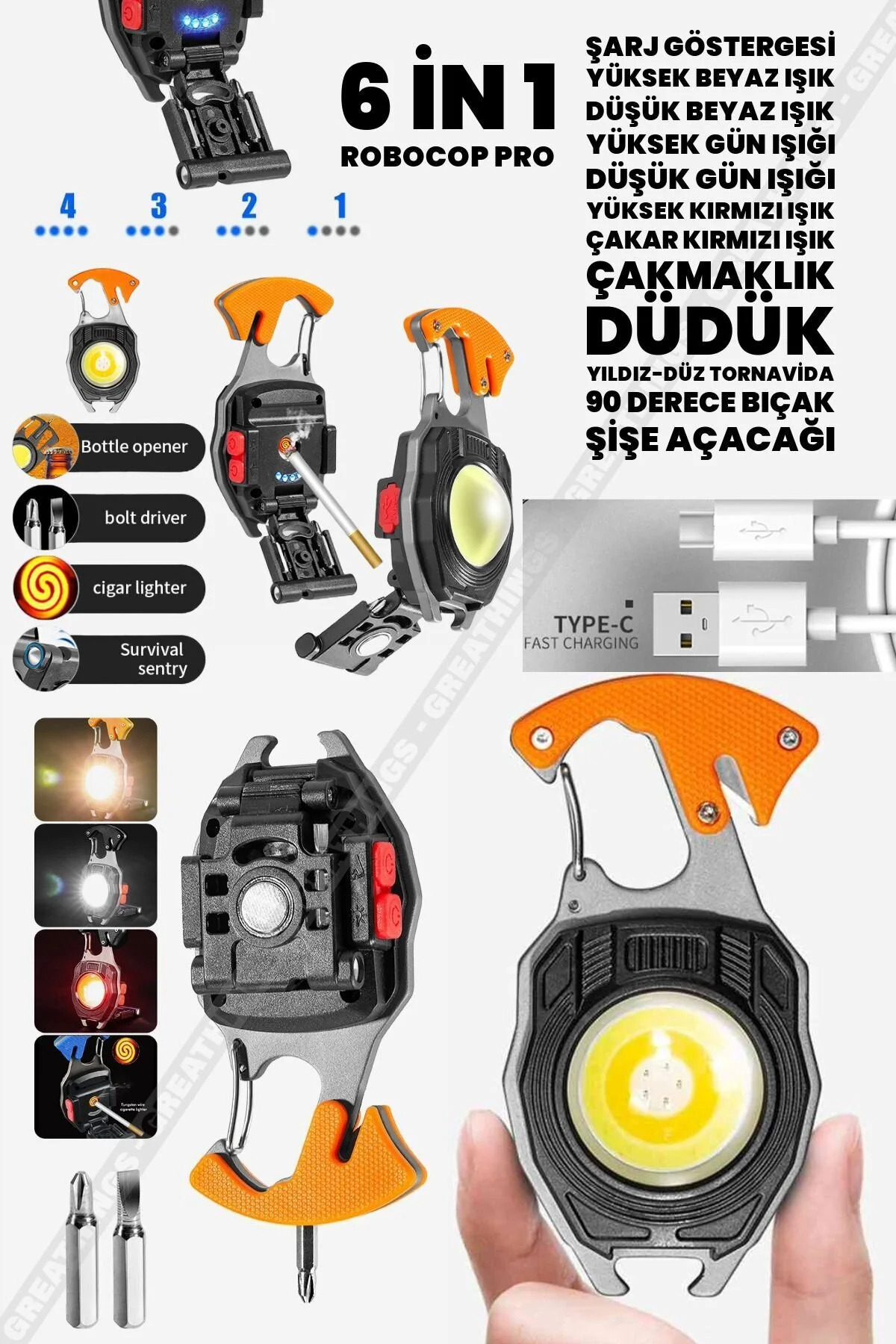Genel Markalar Robocop Pro Kamp Feneri Çok Fonksiyonlu Fener Anahtarlık Usb Çakmaklı Cam Kırıcı Kemer Kesici