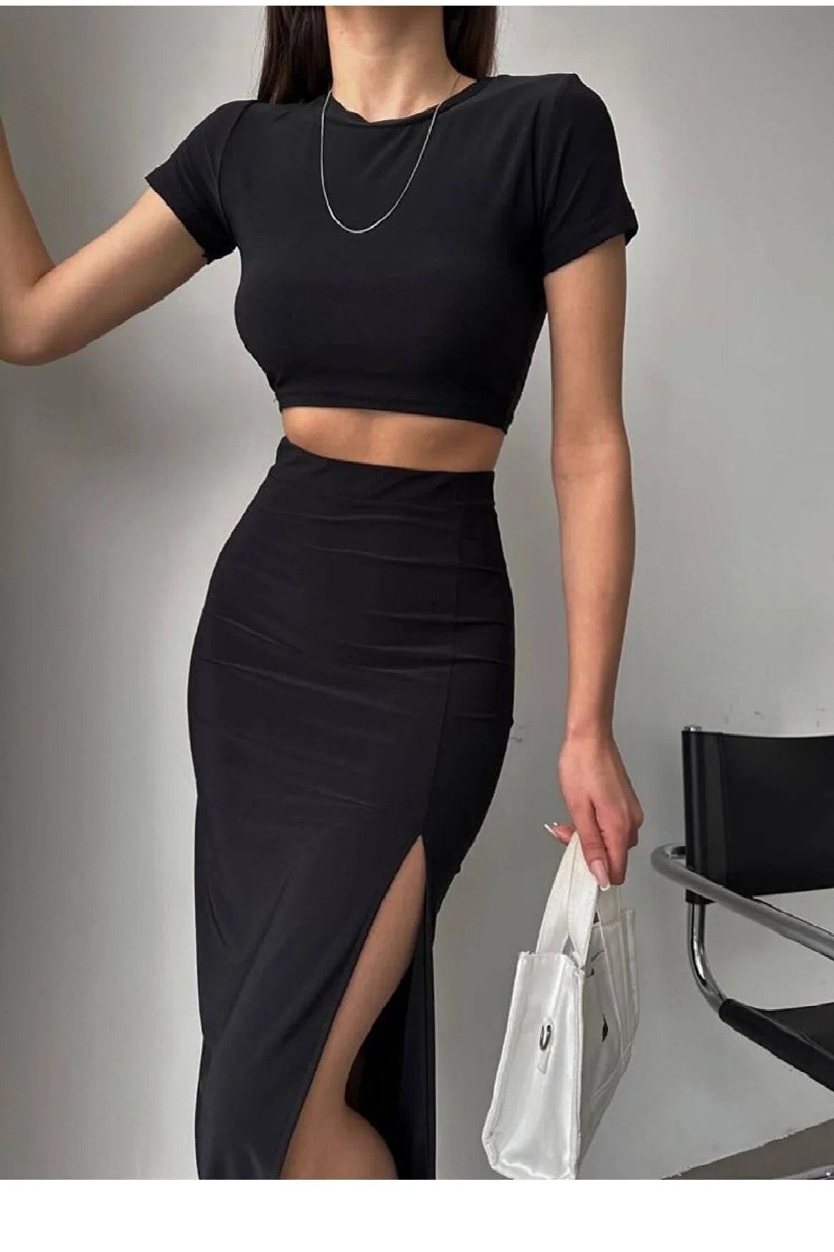Genel Markalar Sandy Kumaş Alt Üst Yırtmaç Etek Crop Takım