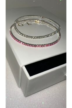 GLARE JEWELRY CO 2 ADET 1mm Pembe ve Beyaz Taşlı Gümüş Renk Paslanmaz Çelik Esnek Bileklik
