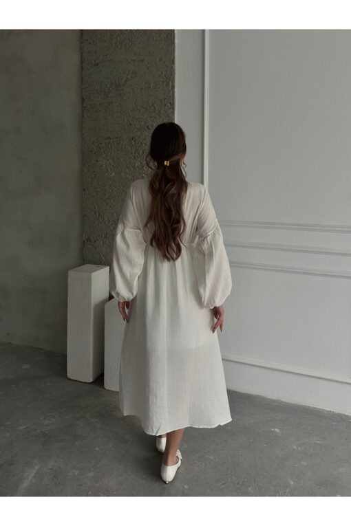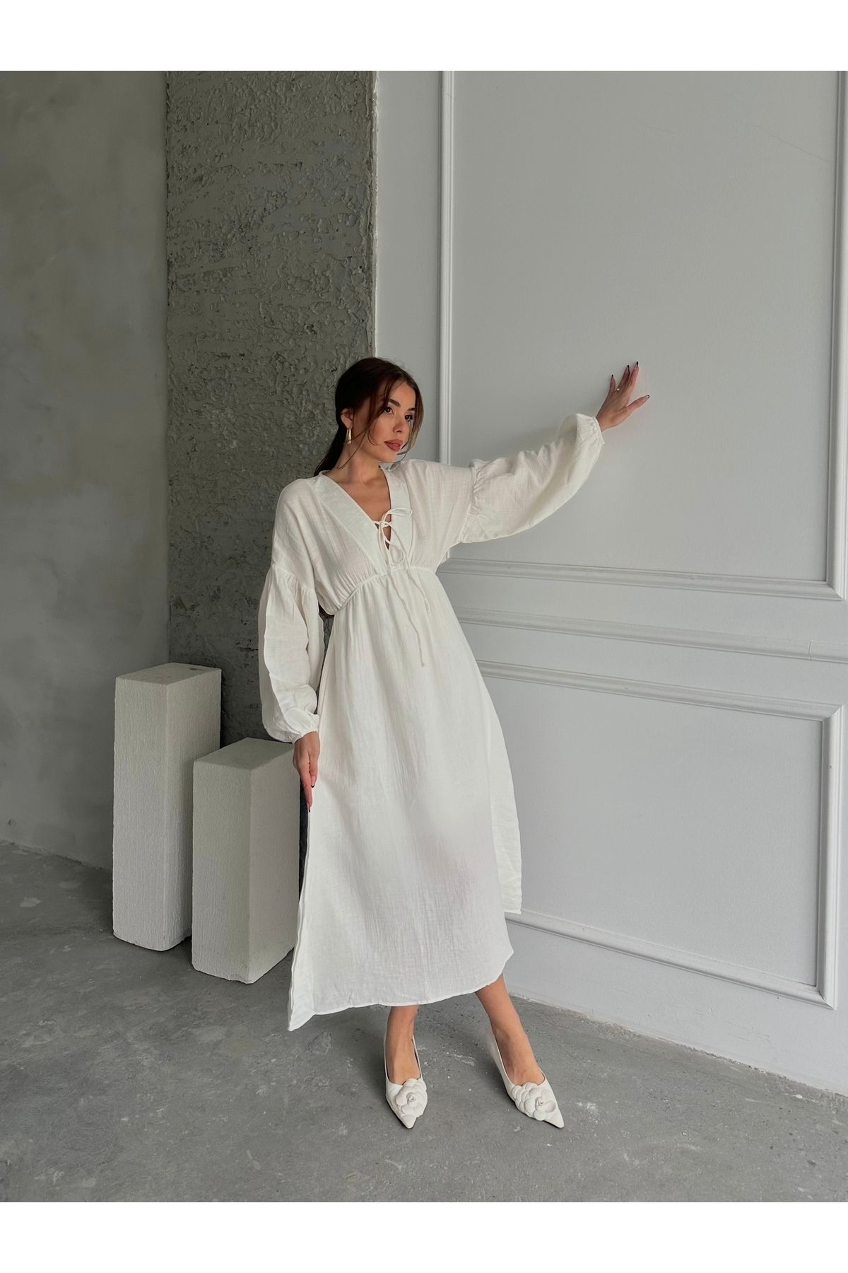 gmbutikk BEYAZ UZUN KOLLU BAĞCIK DETAYLI ELBİSE UZUN ELBİSE