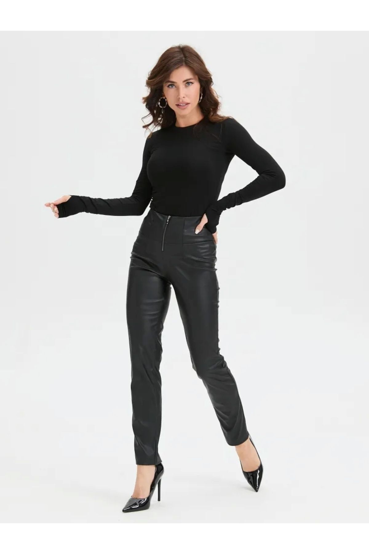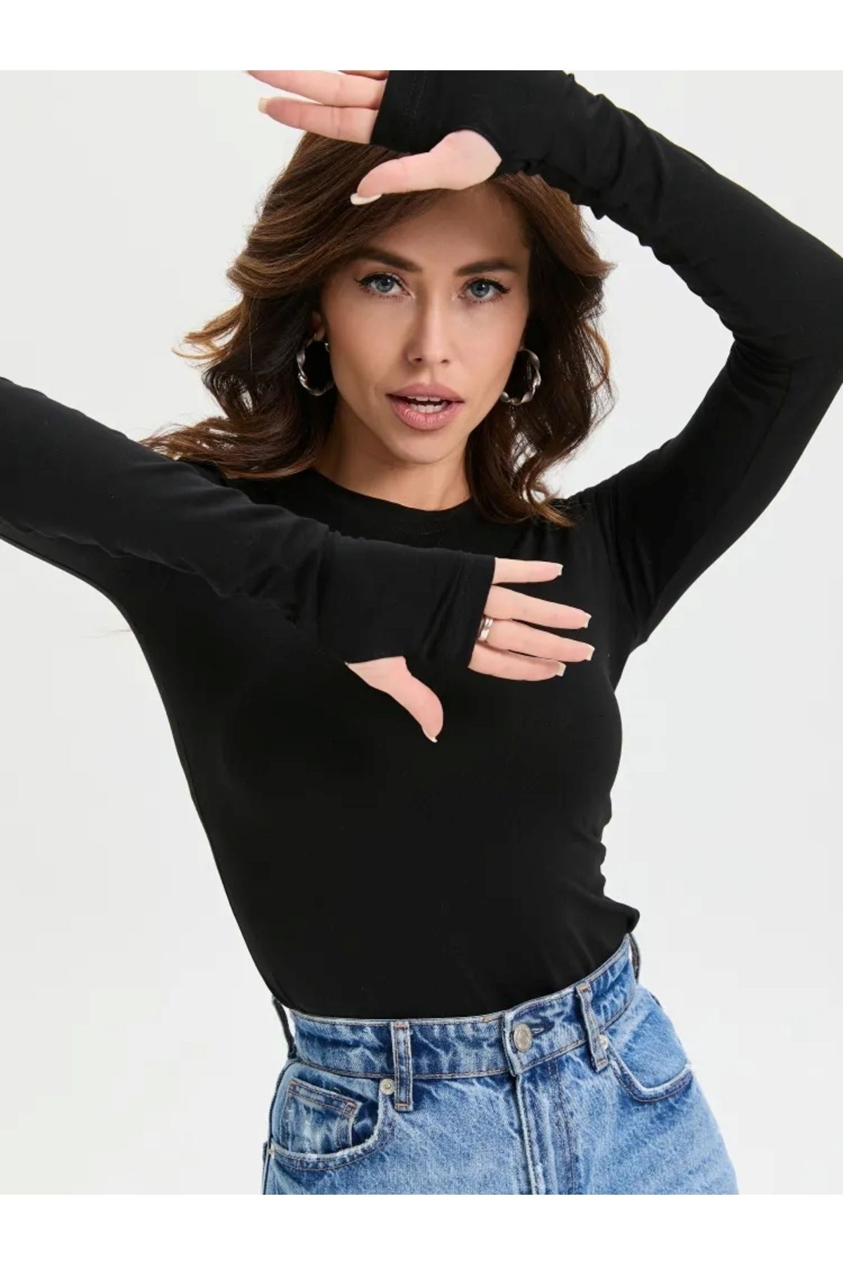 GNSGİYİM Siyah Parmak Geçmeli Uzun Kollu Bisiklet Yaka Viskon Likralı Badi