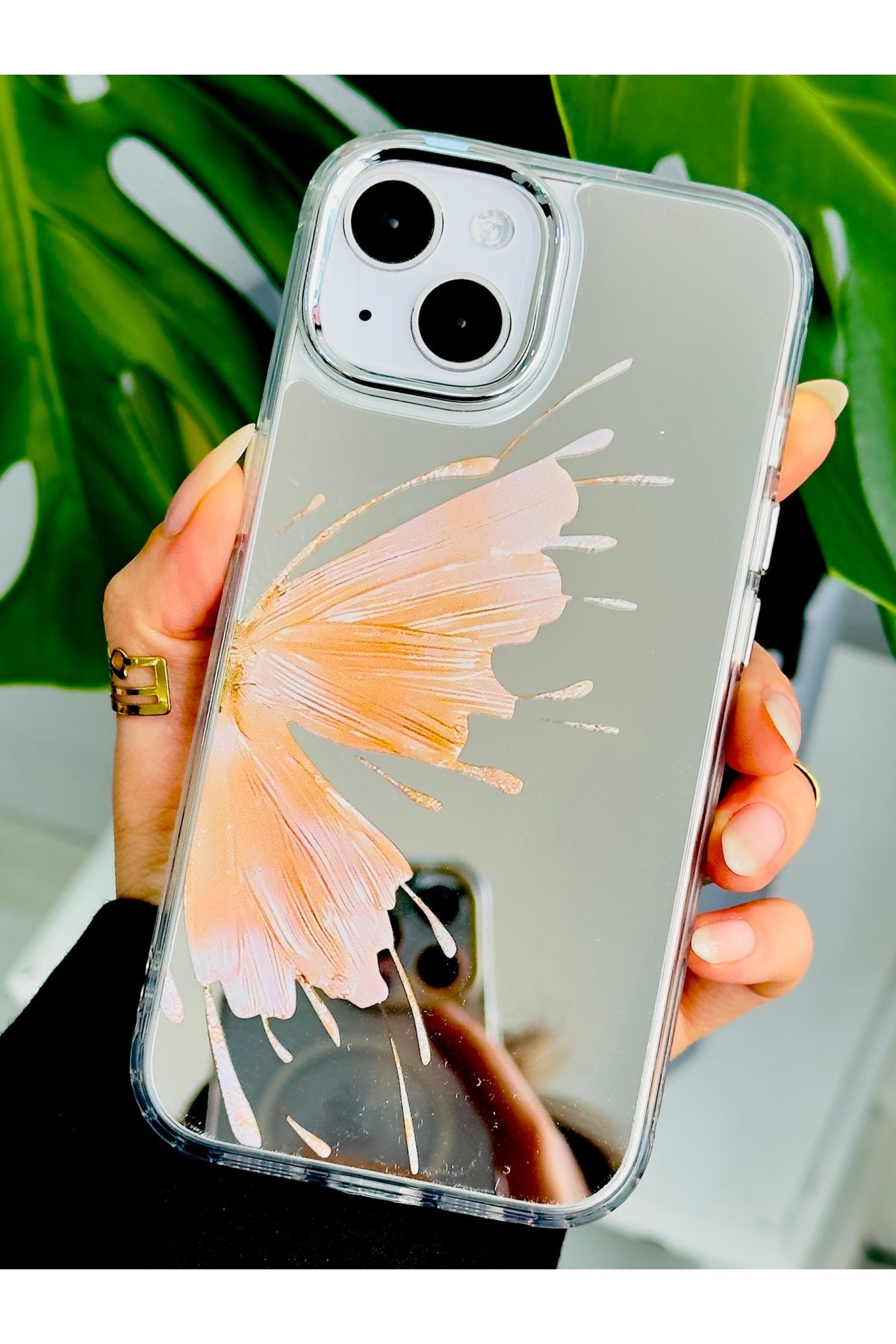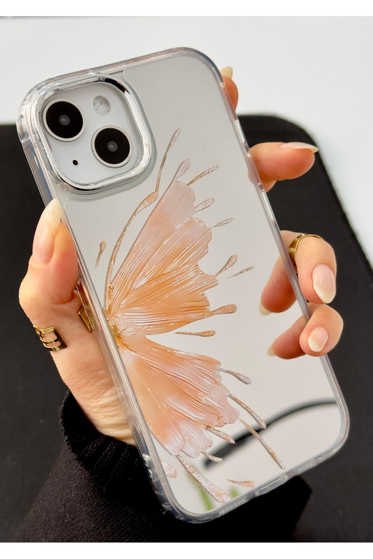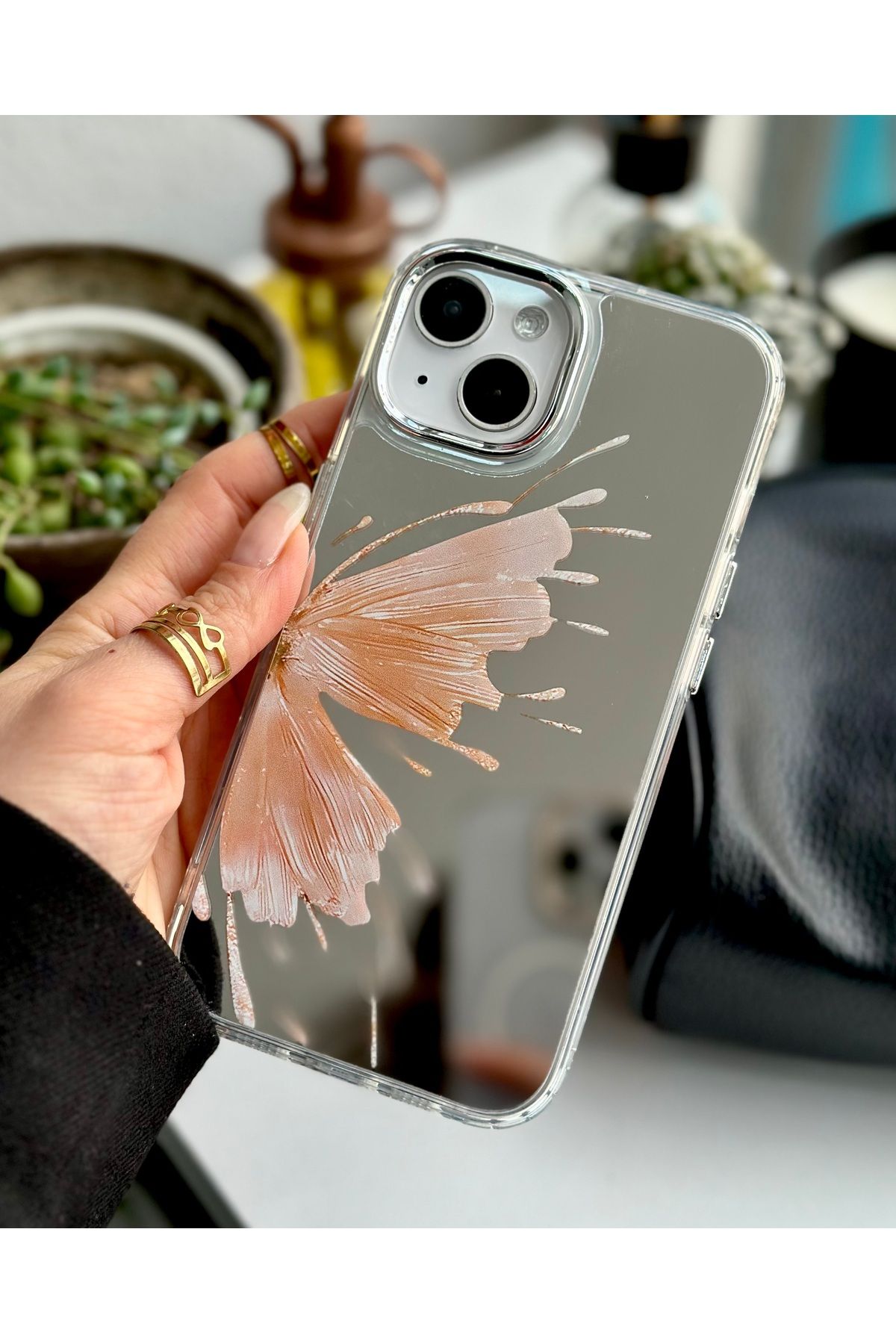 Go Aksesuar Iphone 13 – 14 – 15 Uyumlu Aynalı Gold Kelebek Model Silikon Kılıf