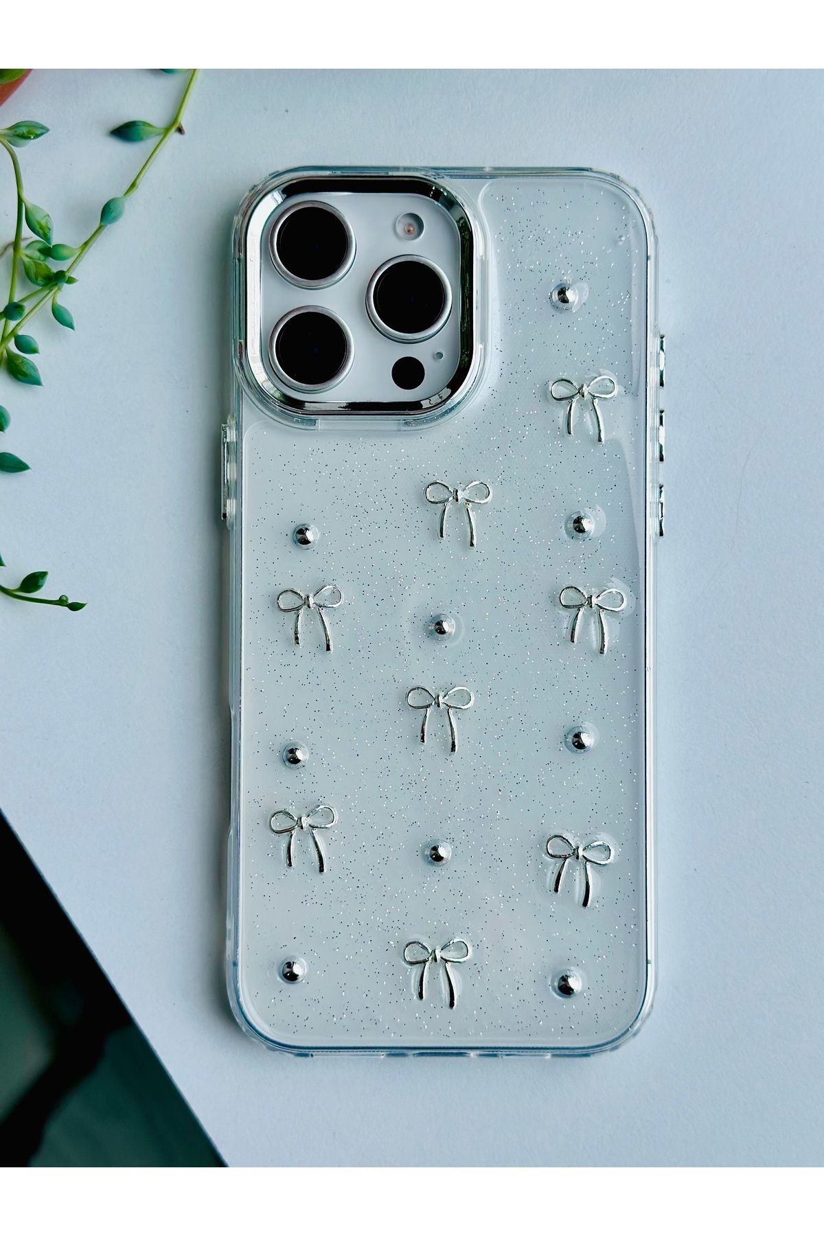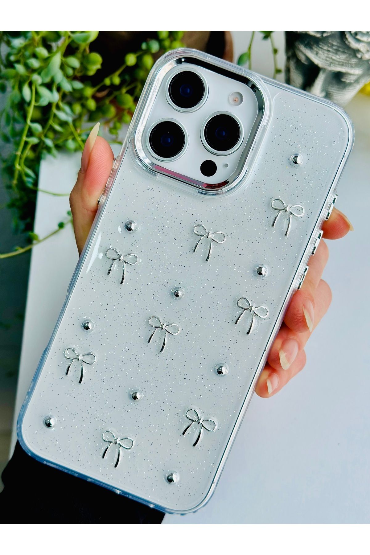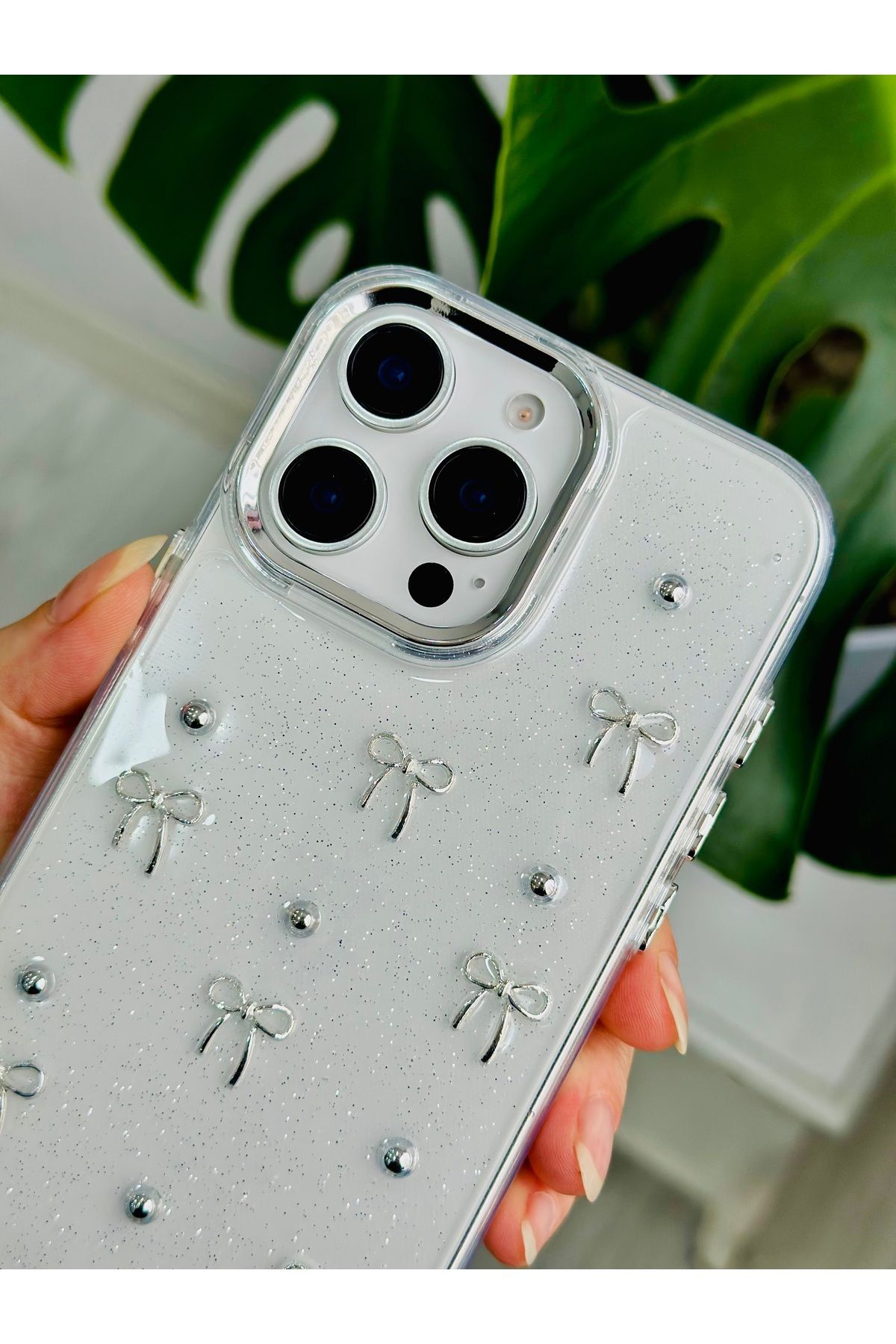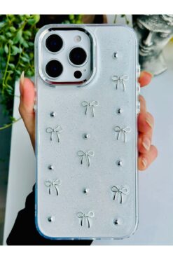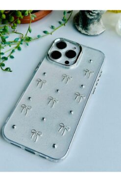 Fibaks Apple iPhone 14 Pro Max Kılıf Fiyonk Desenli Şeffaf Simli Gümüş Kamera Çıkıntılı Parlak Kapak