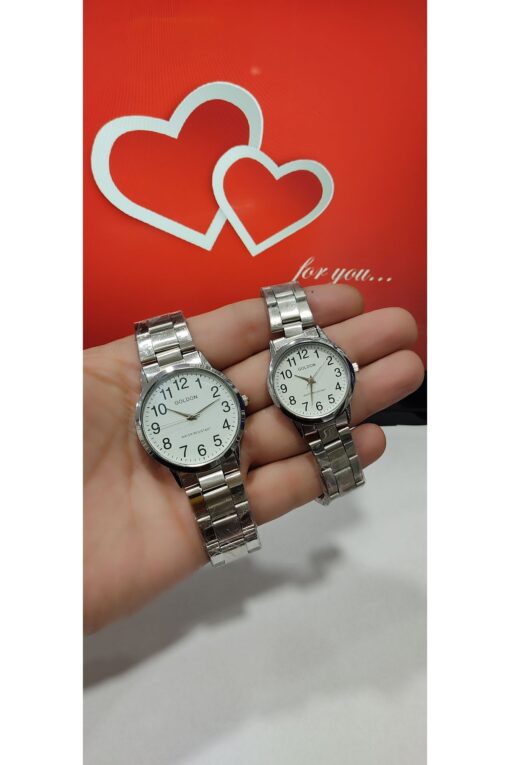 Şık tasarımıyla göz alıcı bir aksesuar olan bu çift klasik sevgili saati, gümüş renkli metal kasa ve düz cam yüzeyiyle zarif bir görünüm sunar.