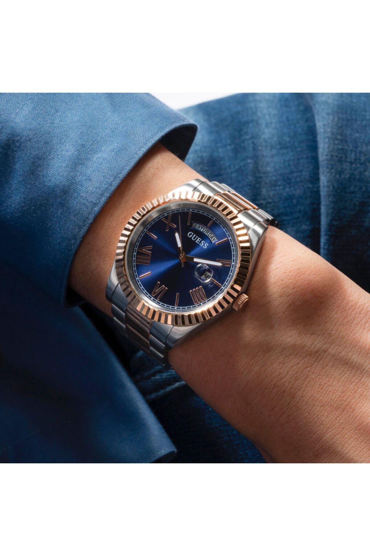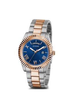 CaseDiameter:42 mm WaterProof:5 ATM CaseThickness:9 mm DialType:Analog StrapLanyardProperty:Çelik KasaMateryali:Çelik Gender:Erkek Yaş Grubu:Erkek CategoryName:Erkek Klasik Saat BrandName:Guess Style:Klasik Saatler DialColor:Mavi CaseColor:Metalik Gri StrapLanyardColor:Metalik Gri/Rose Gold GlassProperty:Mineral Technology:Quartz Calendar:Var CaseStone:Yok Alarm:Yok DialStone:Yok Kronometre:Yok KadranTasi:Yok CaseShape:Yuvarlak
